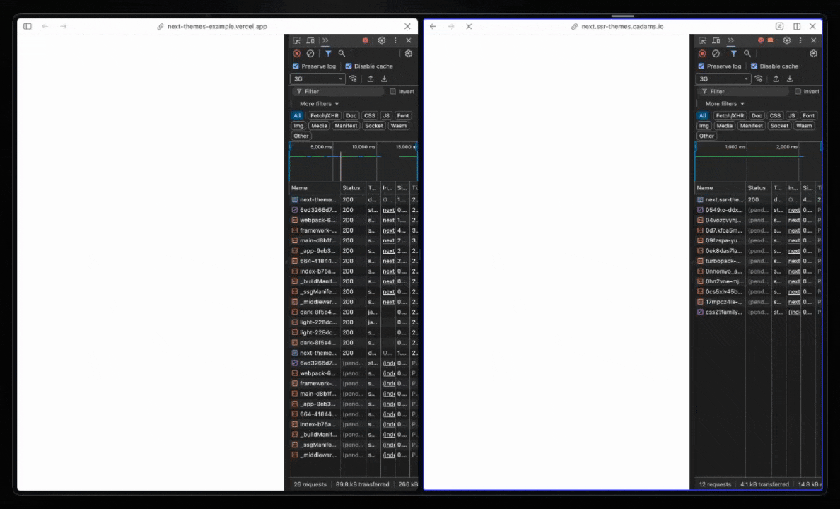 The server is usually unaware of the client theme. This skew between the server default and what is hydrated on the client often results in a flash of the wrong content.
