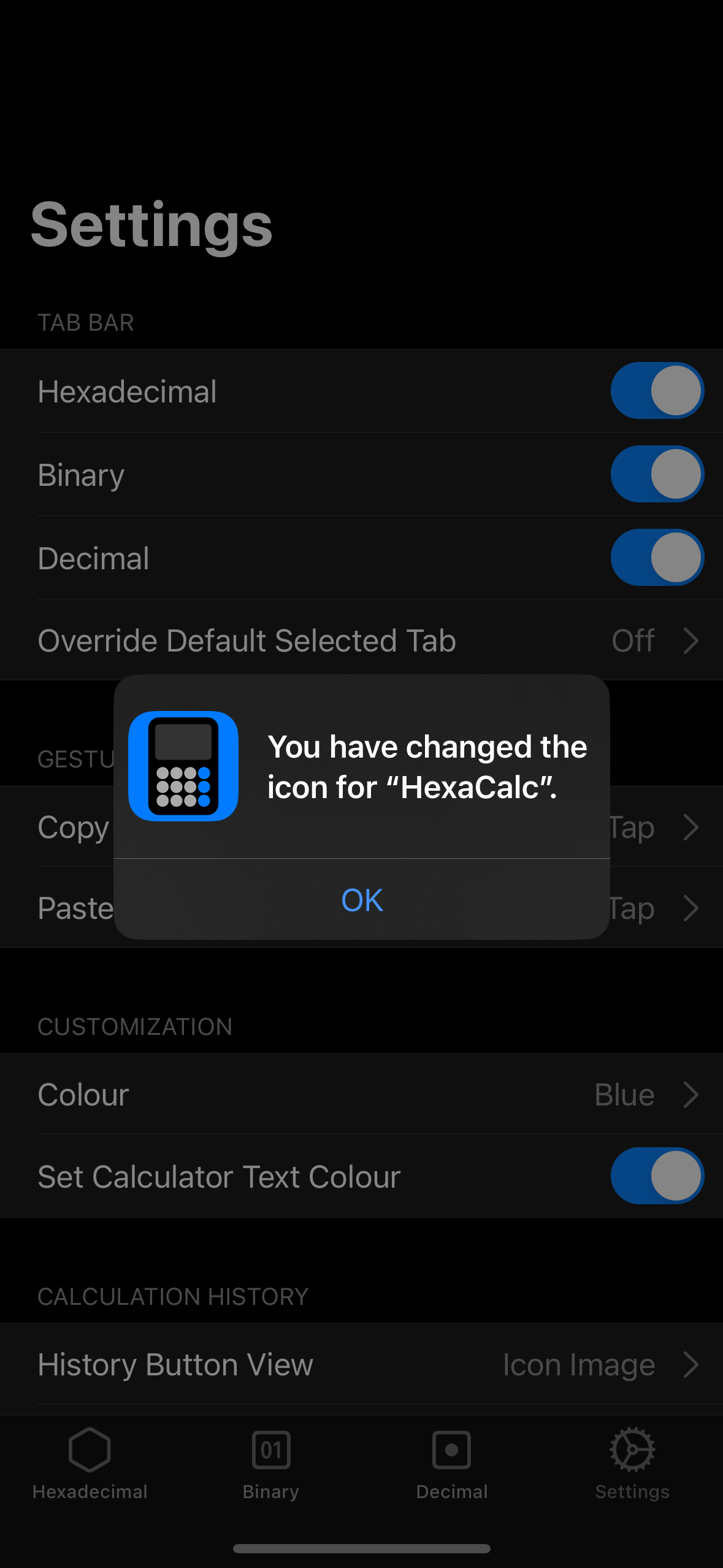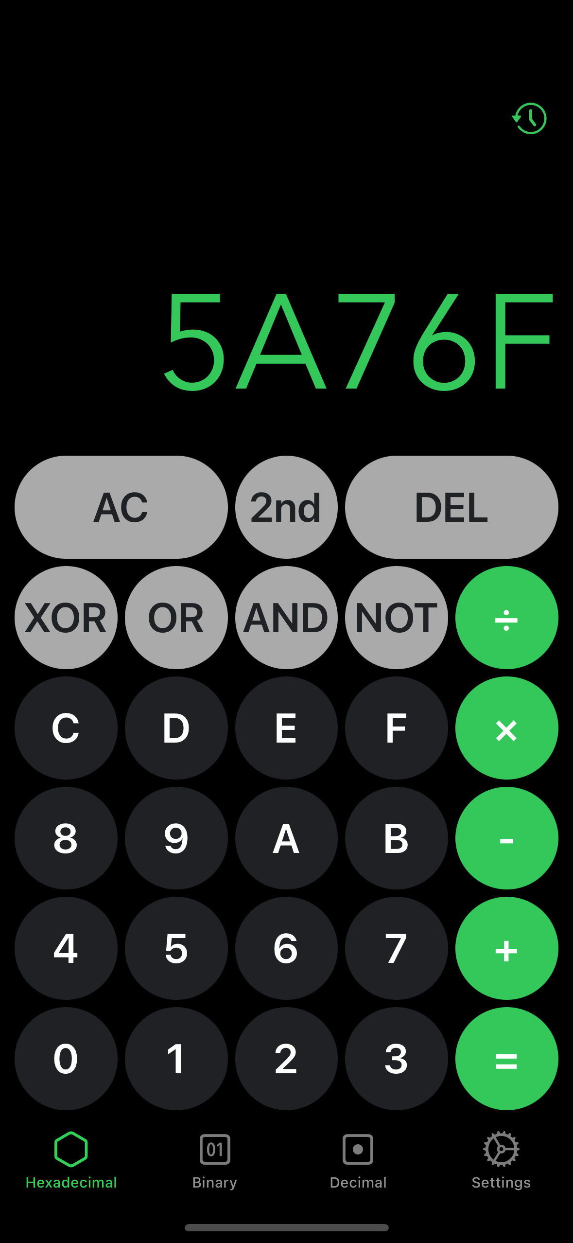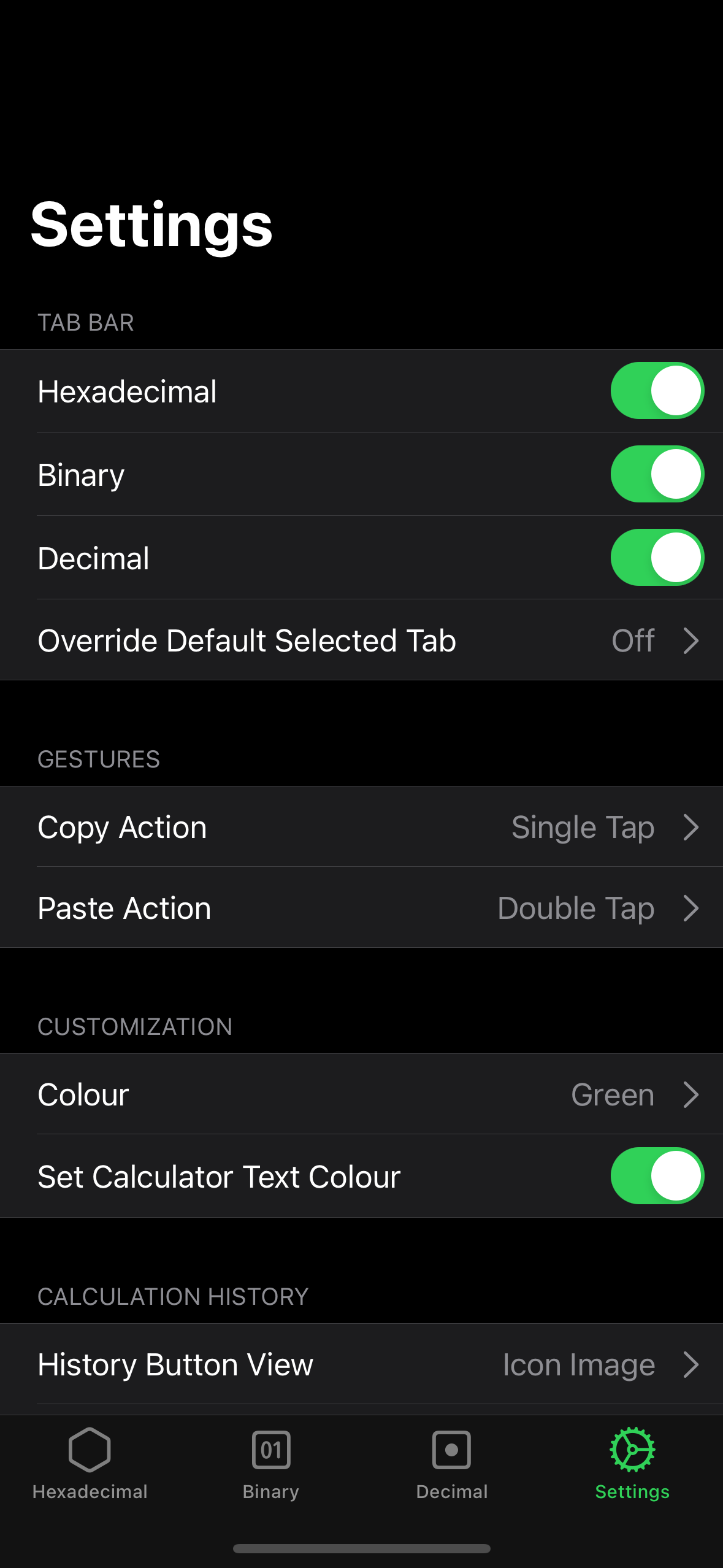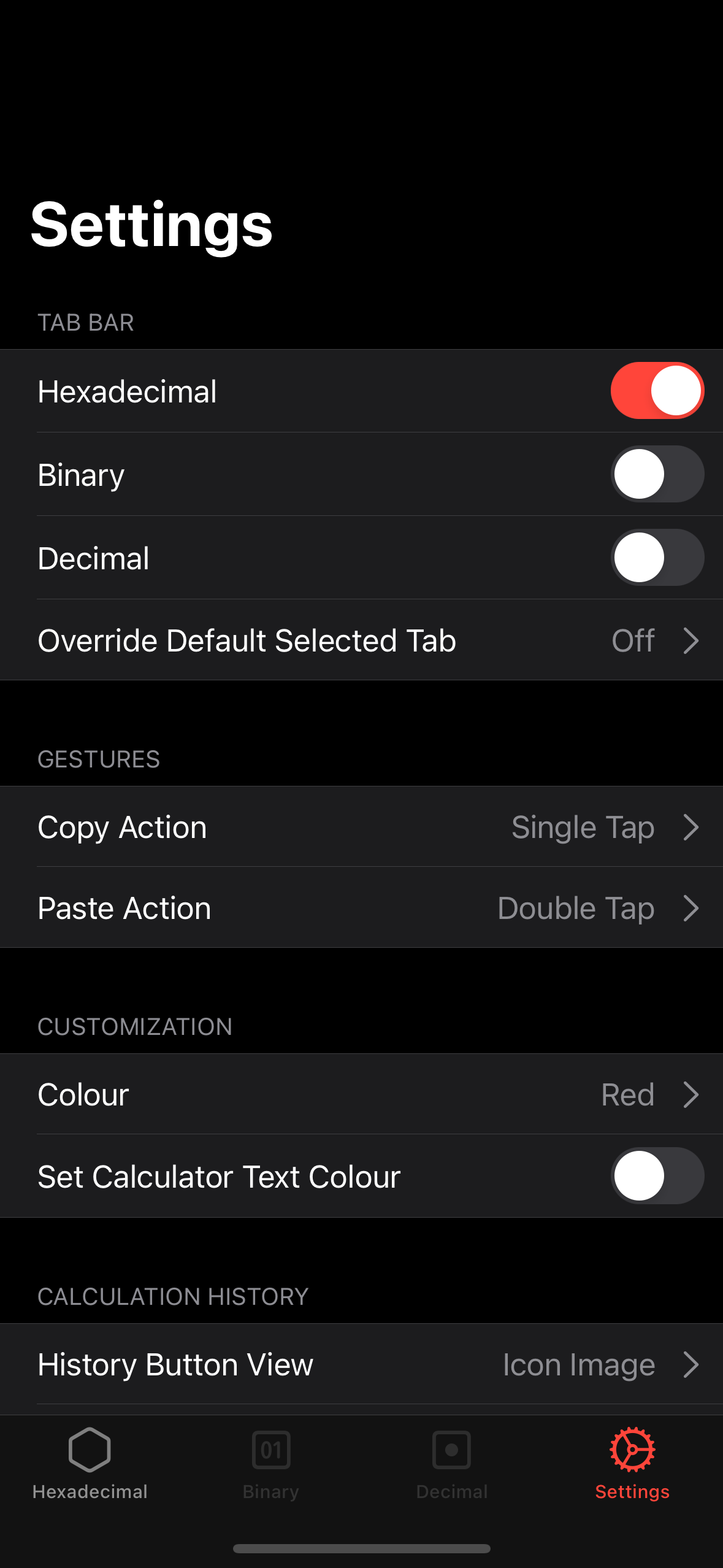 Three tabbed calculator for decimal, hexadecimal and binary for iOS built in Swift with Xcode. Provides numerous operations and seamless conversion between the three tabs.