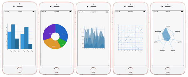 • Pie, Bar, Smoothline, Stockline, Scatterplot, Tree and Radar graphs