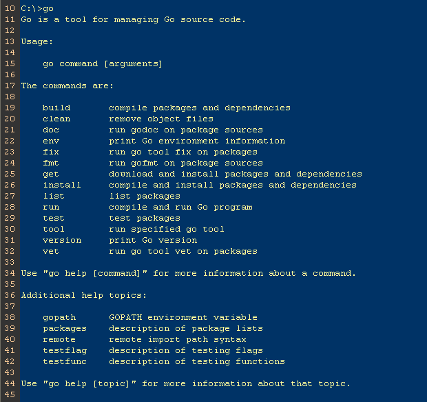 El lenguaje Go viene con un conjunto completo de herramientas de comandos operacionales. Puedes ejecutar en la lína de comando go para verlas: