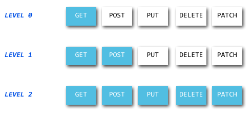 La figura de arriba nos muestra tres niveles actualmente implementados en REST. puedes escoger no seguir todas las reglas y restricciones de REST cuando estás desarrollando tus aplicaciones propias, porque a veces no encajan en todas las situaciones. Las aplicaciones RESTful usan todos los métodos HTTP incluyendo DELETE y PUT, pero en muchos casos, los clientes solo envían peticiones GET y POST.