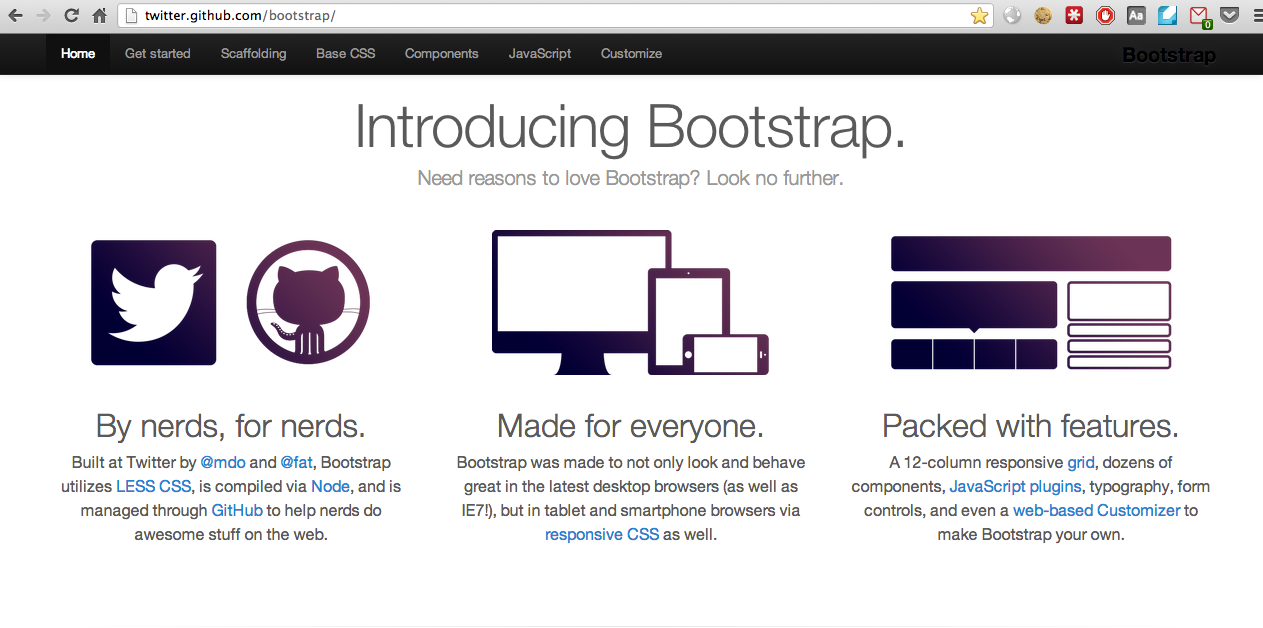 Bootstrap is an open source Toolkit for front-end development launched by Twitter. For developers, Bootstrap is one of the best front end kits for rapid Web application development. It is a collection of HTML, CSS and javascript components, using the latest HTML5 standards. These include a responsive grid, forms, buttons, tables, and many other useful things.