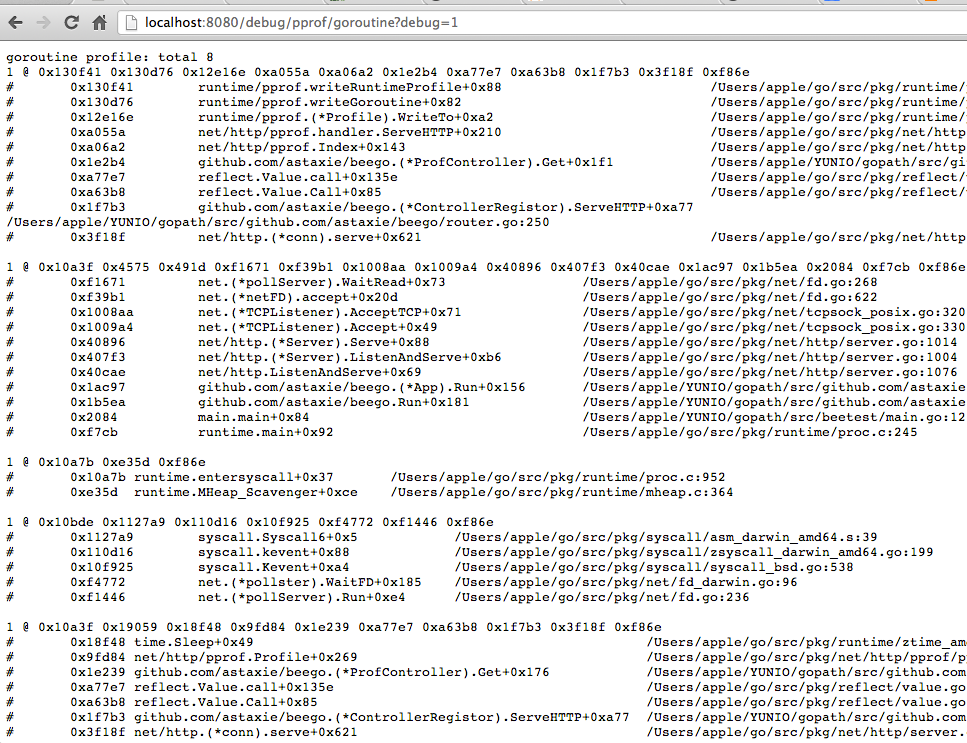 The Beego framework currently supports pprof, however it is not turned on by default. If you need to test the performance of your application, (for instance by viewing the execution goroutine) such information from Go's default package "net/http/pprof" already has this feature. Because beego has repackaged the ServHTTP function, you can not open the default feature included in pprof. This resulted in beego supporting pprof internally.