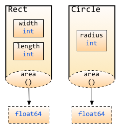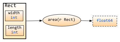 }Yukarıdaki örnek bir Dikdortgen'in alanını hesaplayabilir. Burada alan isimli fonksiyonu kullanıyoruz, fakat bu fonksiyon Dikdortgen struct'ının bir method u değil(klasik nesne yönelimli dillerdeki sınıf nethodları gibi). Fark edebileceğiniz gibi fonksiyon ve struct iki bağımsız şeydir.