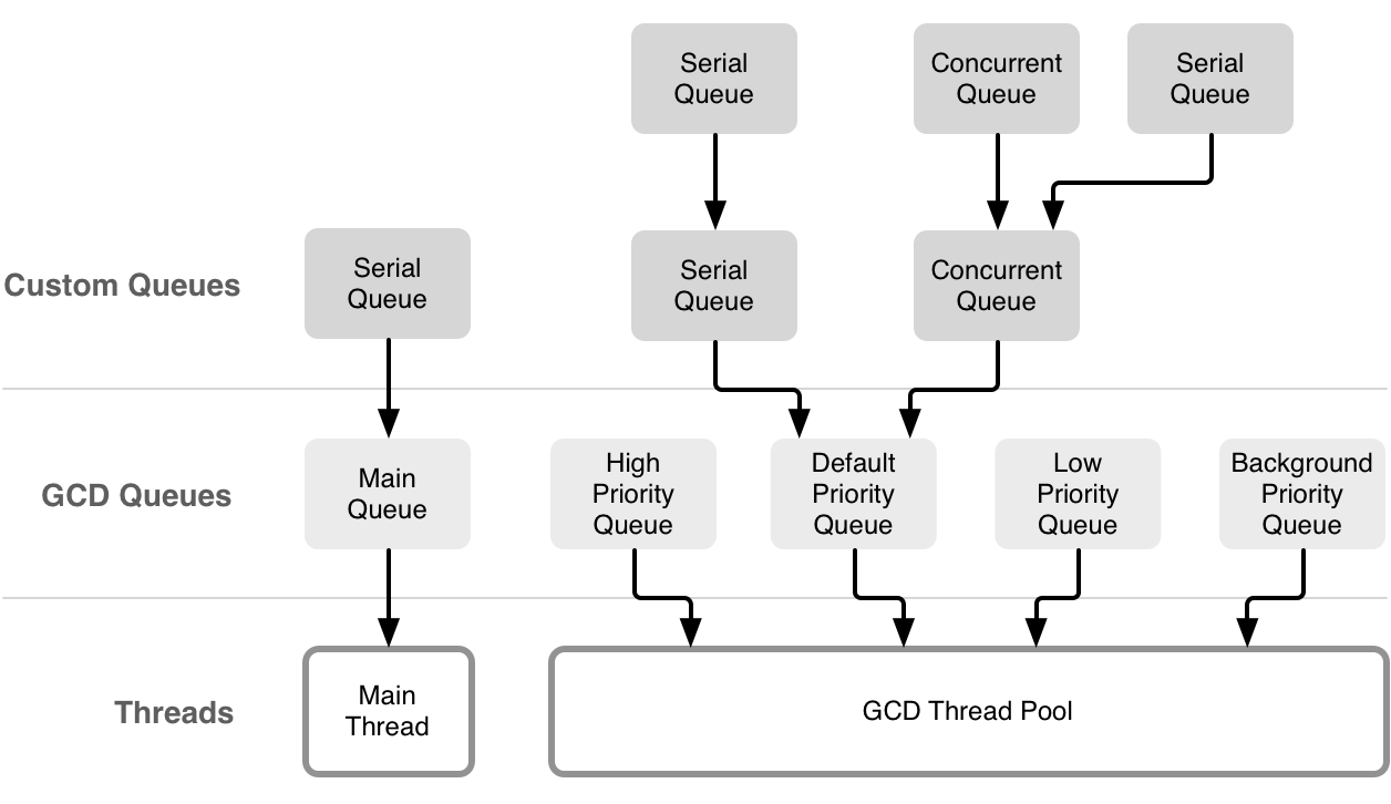 }队列其实就是一个用来提交 block 的对象,当 block 提交到队列中后,将按照 “先入先出(FIFO)” 的顺序进行处理。系统在 GCD 的底层会维护一个线程池,用来执行这些 block。