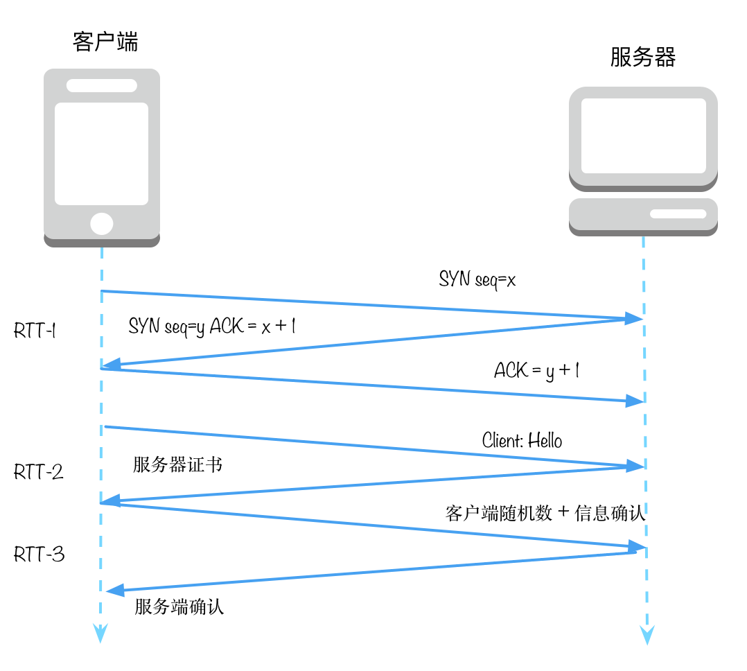 我们考虑一次 HTTPS 请求,它的基本流程是三次 TCP 握手外加四次 SSL/TLS 握手,从图中可以看到这需要三个 RTT: