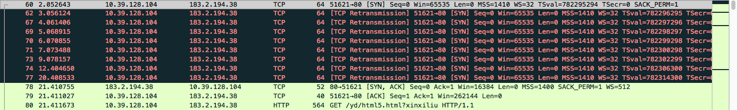 这次事情就更离谱了,第二秒发出的 SYN 握手包反复丢失(也有可能是服务端没有响应、或者是 ACK 丢失),总之客户端不断重传 SYN 包。