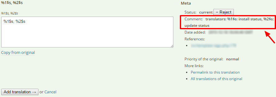 The context is used to describe the entire string, translators comment are used to describe specific placeholders like %s, %1$s, %2$s and others.