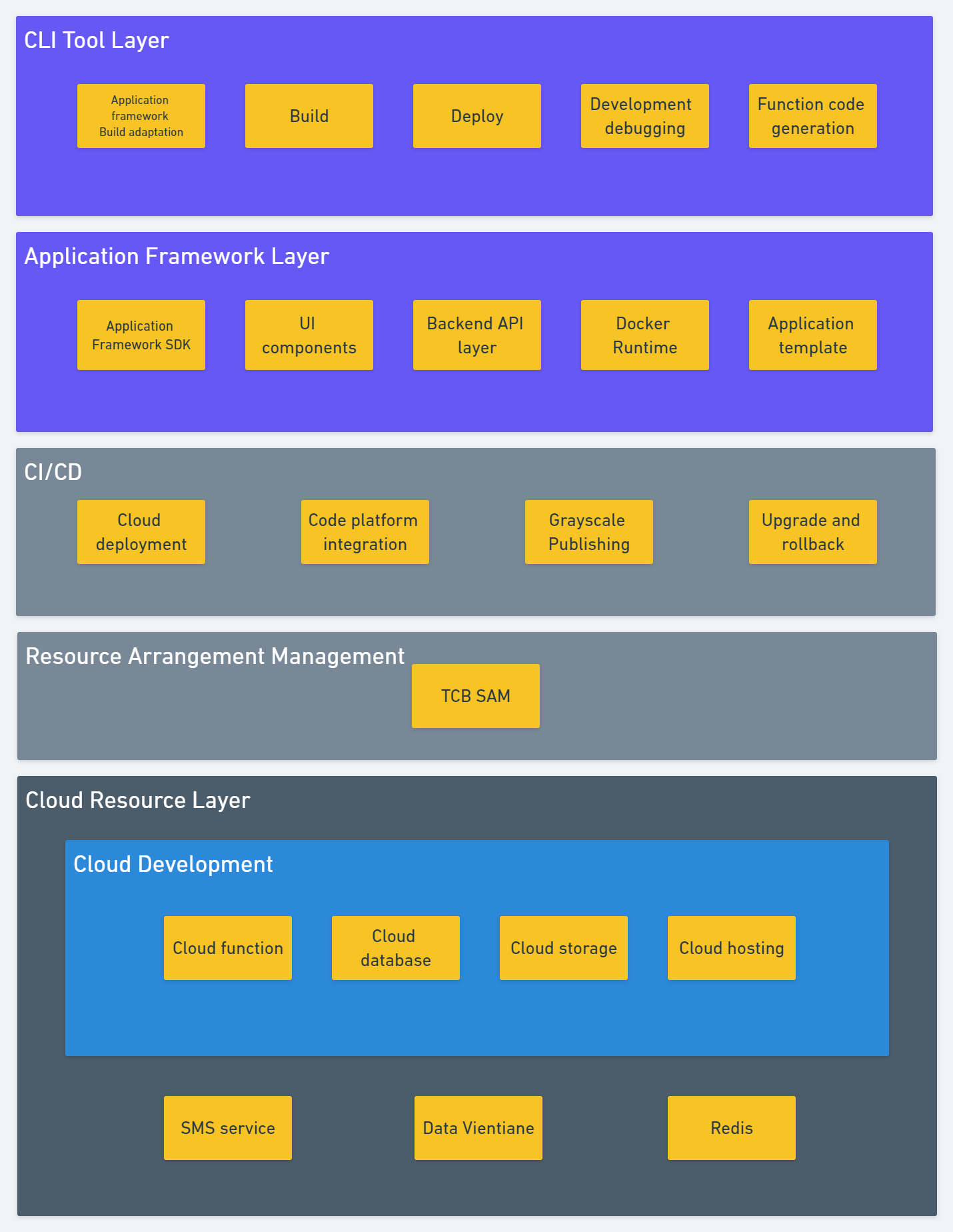 Cloud Development CloudBase Framework is based on cloud development underlying resources and cloud development resource orchestration management, and it includes CLI tool layer, application framework layer, and CI/CD layer as a whole.