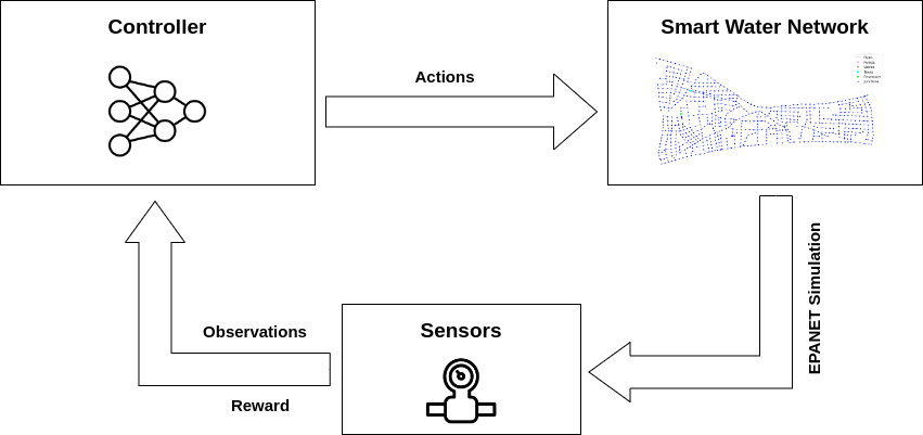 Besides related control tasks such as state estimation and event diagnosis, a special focus of this Python package is Reinforcement Learning for data-driven control in WDNs and therefore it provides full compatibility with the Stable-Baselines3 package.