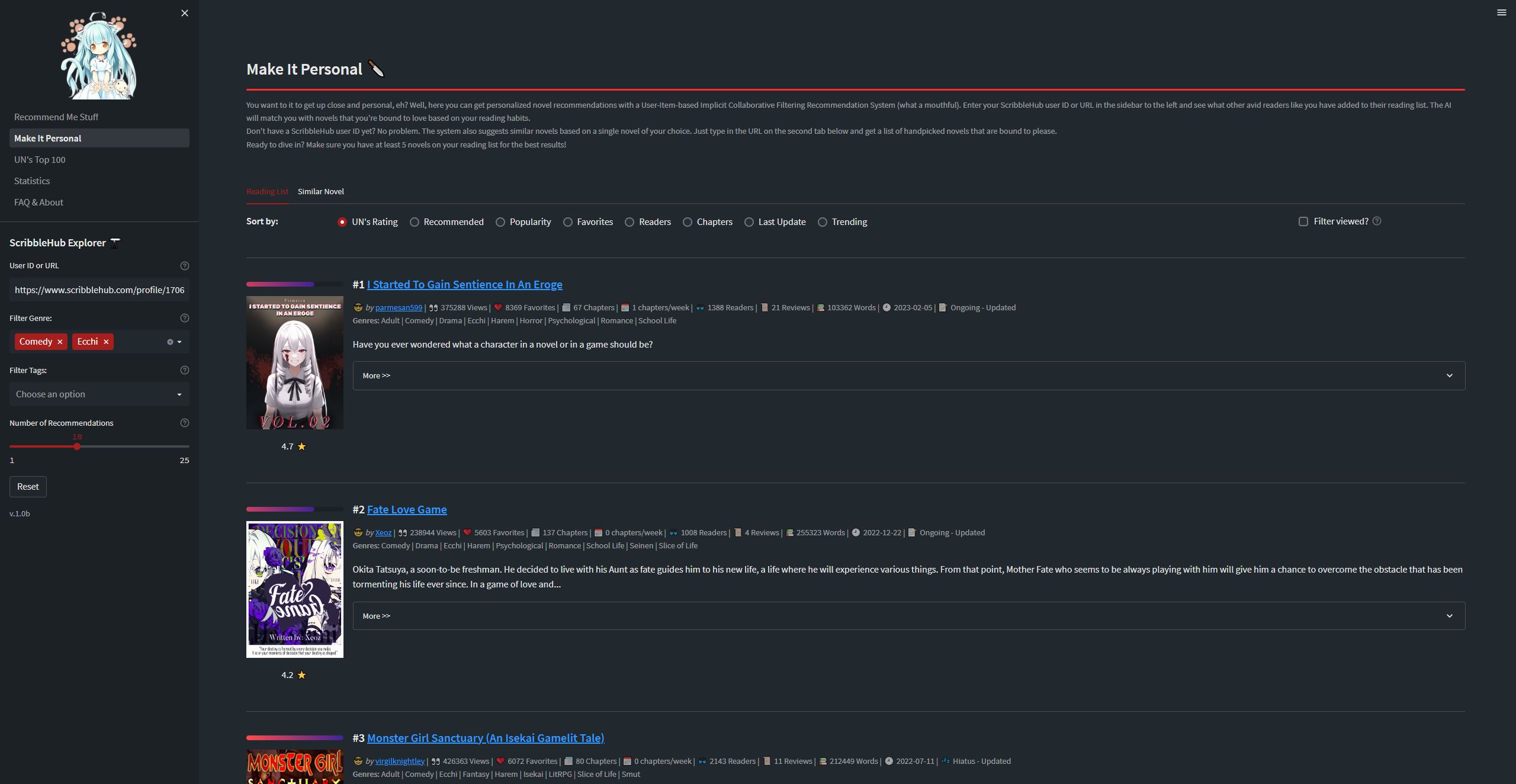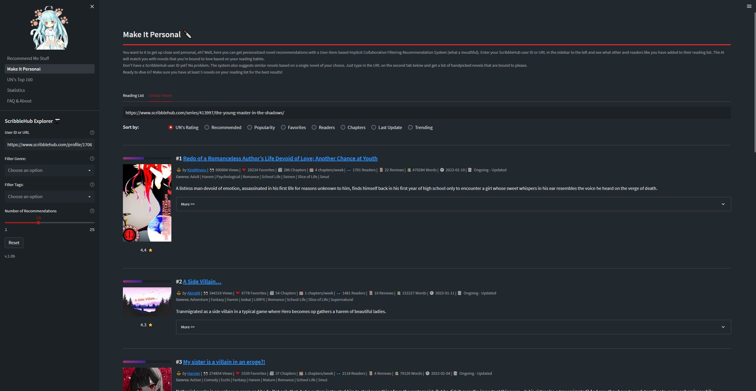 - ⚙️ Dynamically update recommendation engine based on new users and novels. E.g., if a user has enabled public viewing of their reading-list, or changed their reading list, then query ScribbleHub for the latest version. This is both to reduce the load on ScribbleHub servers, but also to improve the user experience (alway having the latest updated reading list).