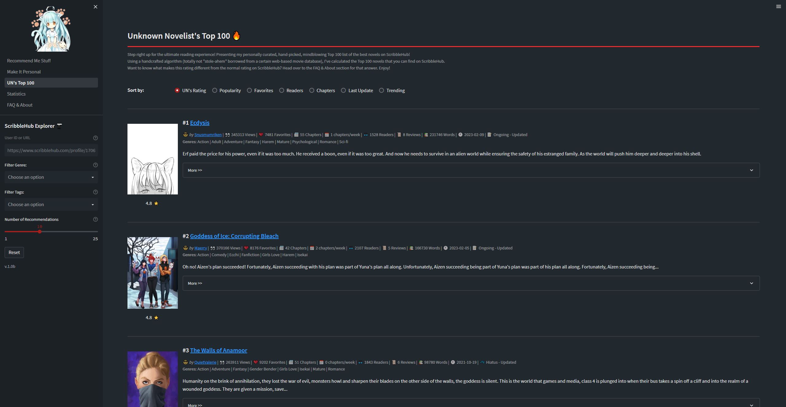 - 📈 More sorting options (sort by chapters per week, word count, pageviews, date added, number of ratings, reviews, etc.)
