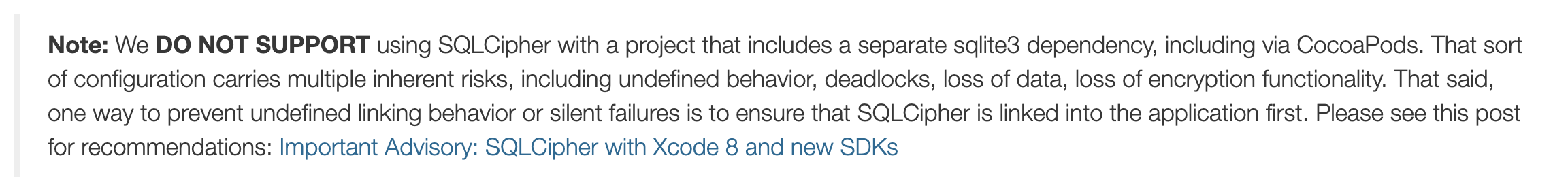 xcconfigs that get set up in order to make that work. Looking at theREADMEfor FMDB, another iOS SQLite lib, I see a similar caveat about how to set up the podspec.Looking at the tutorial on SQLCipher, there's a fairly blunt caveat about only using their SQLite 3: