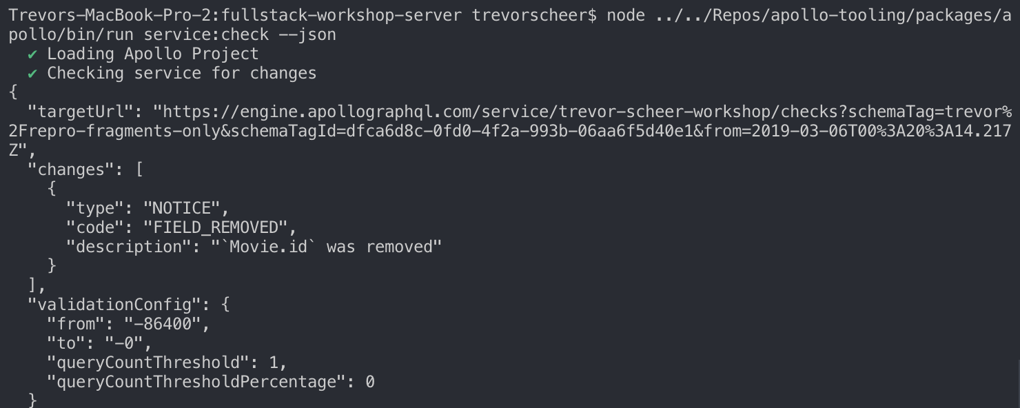 Add a --json flag as an option for output from service:check. This makes the output more easily parsed by other tools.
