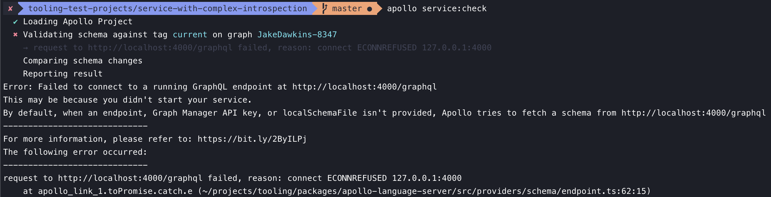 localSchemaFileare provided, the language server relies on the default endpointhttp://localhost:4000. If there is no server running there, it will 404. If the user has a service to run there (or anywhere else) but forgets to start it up, it will also 404. This PR adds an error for both of those cases. If the URL IS the default one, it will provide info about that.TODO: