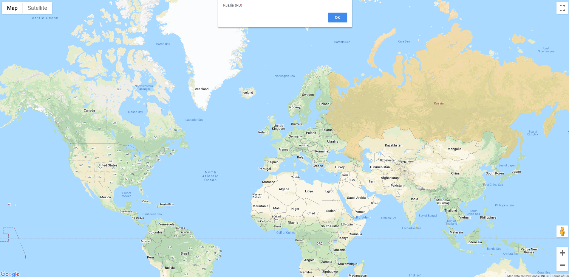 Clickable countries using Google Maps JS API. You can use this sample code to create maps with clickable countries, borders etc.