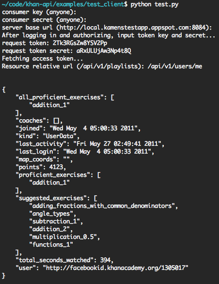 - You'll now have a loop that lets you run Khan Academy API queries, authenticated as the user you logged in as.