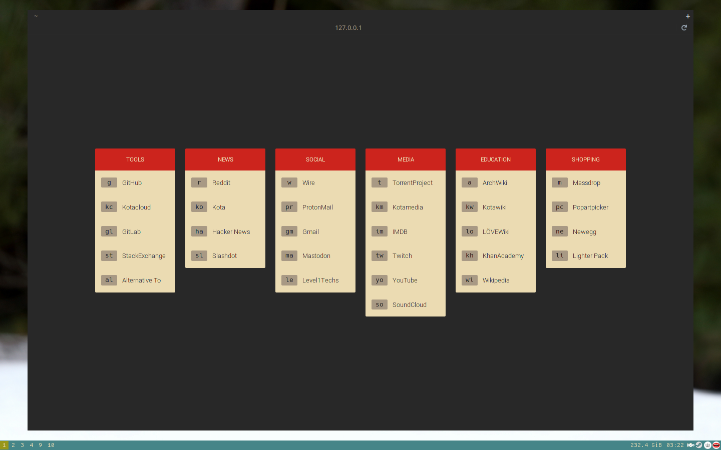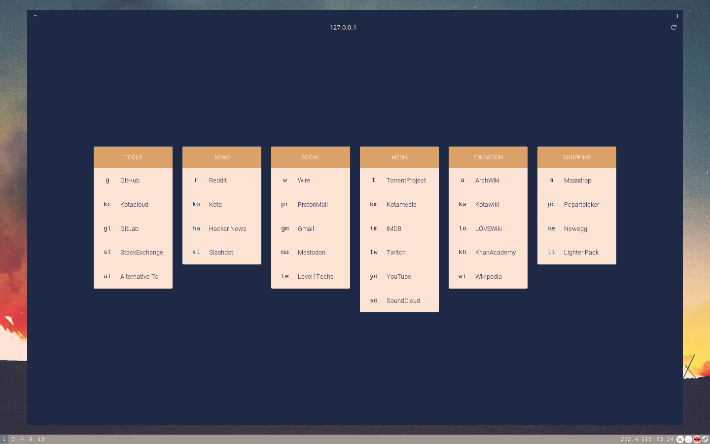 The homepage is setup giving you a nice clean search bar which you can easily search your favorite search engine with (by default it's duckduckgo)