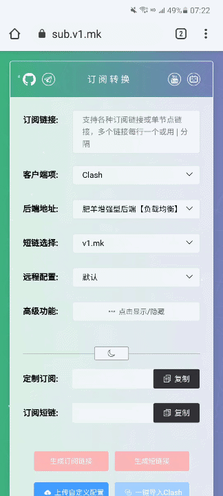 最美订阅转换基于项目CareyWang/sub-web,重制CSS样式,增加“暗黑模式”,监听系统默认主题,自动切换亮/暗模式(点击“太阳/月亮”图标可手动切换),增加“高级功能”点击显示/隐藏,解决当手机浏览器切换电脑UA时,远程配置添加过多后,布局乱的问题,解决重新载入网页依然保留上次订阅的问题,添加短链接选择/自定义功能,增加近百条远程配置!