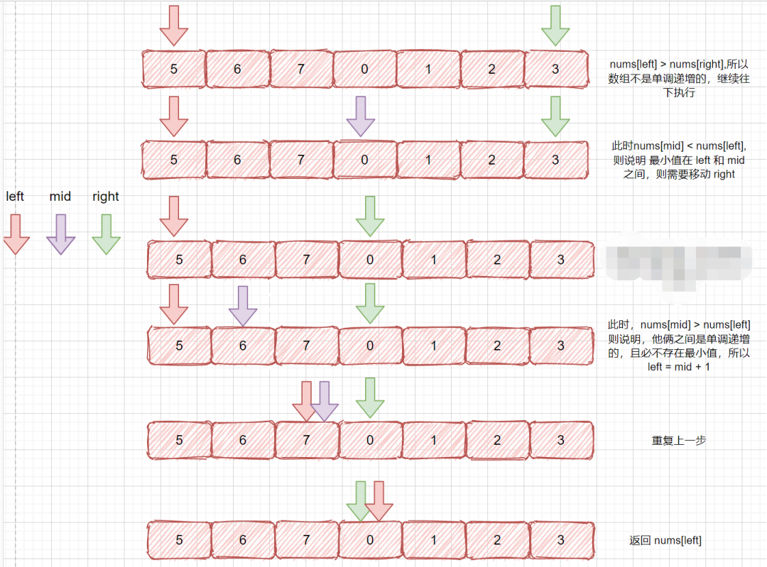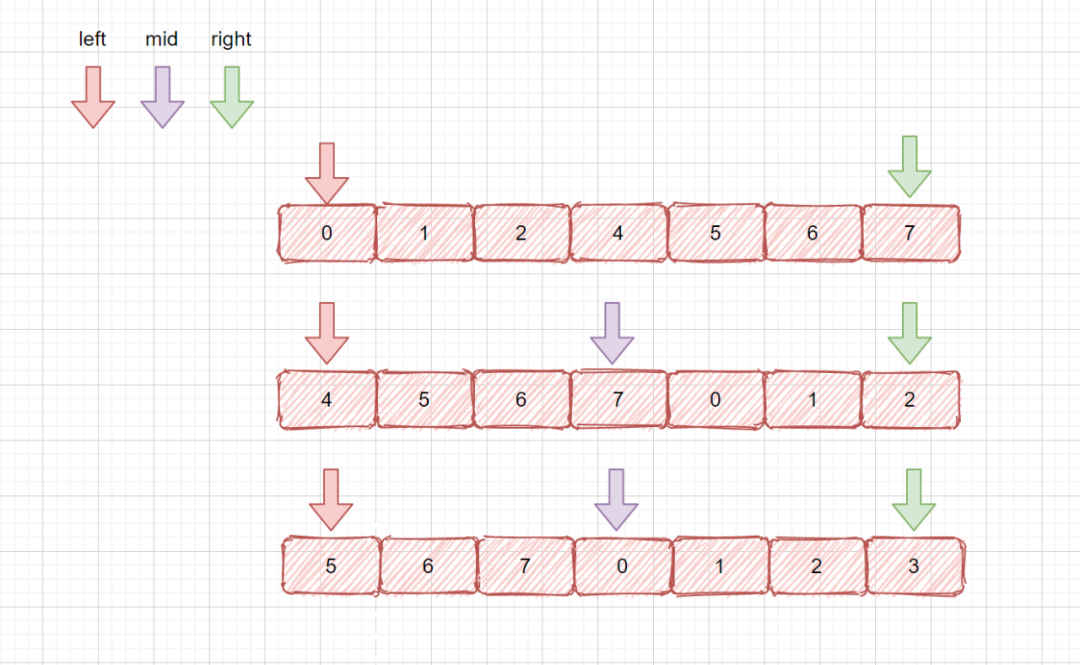 我们在上面的描述中已经和大家分析过几种情况,下面我们一起来看一下,[5,6,7,0,1,2,3]的执行过程,相信通过这个例子,大家就能把这个题目整透了。