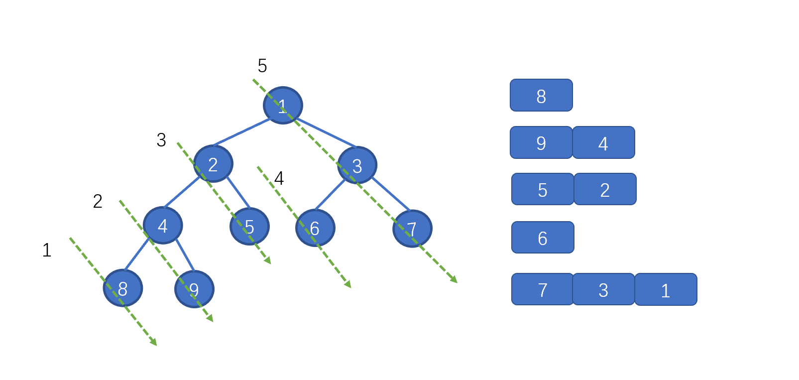 上图中的一个绿色虚线,代表一个链表,我们根据序号进行倒序遍历,看下是什么情况