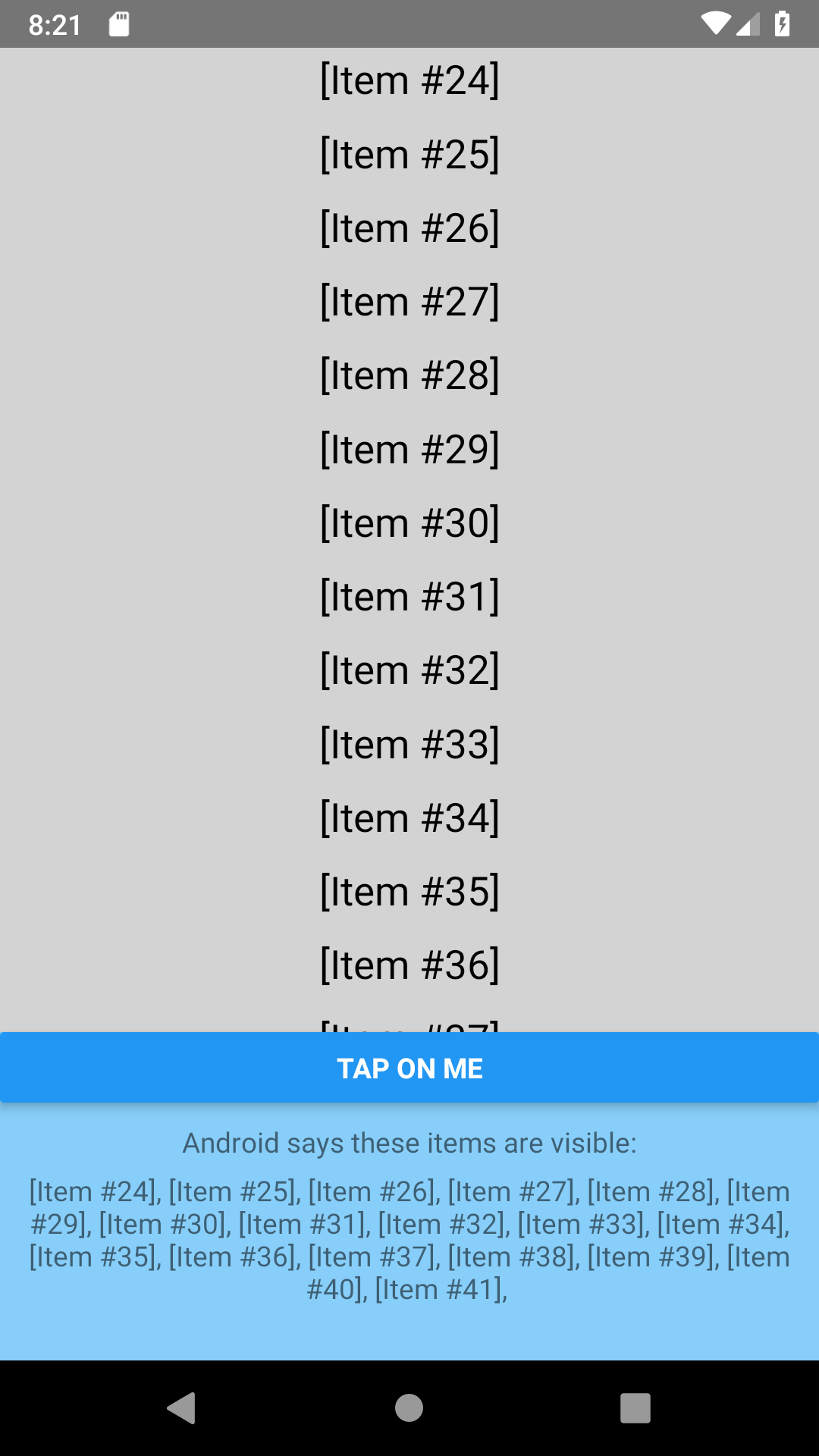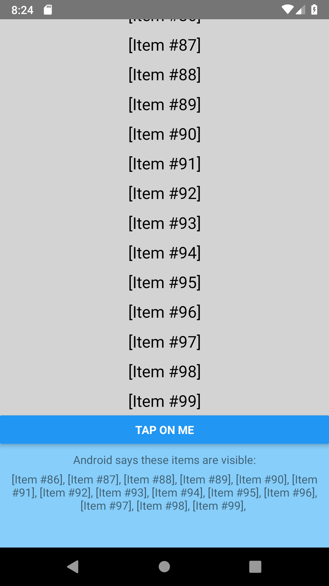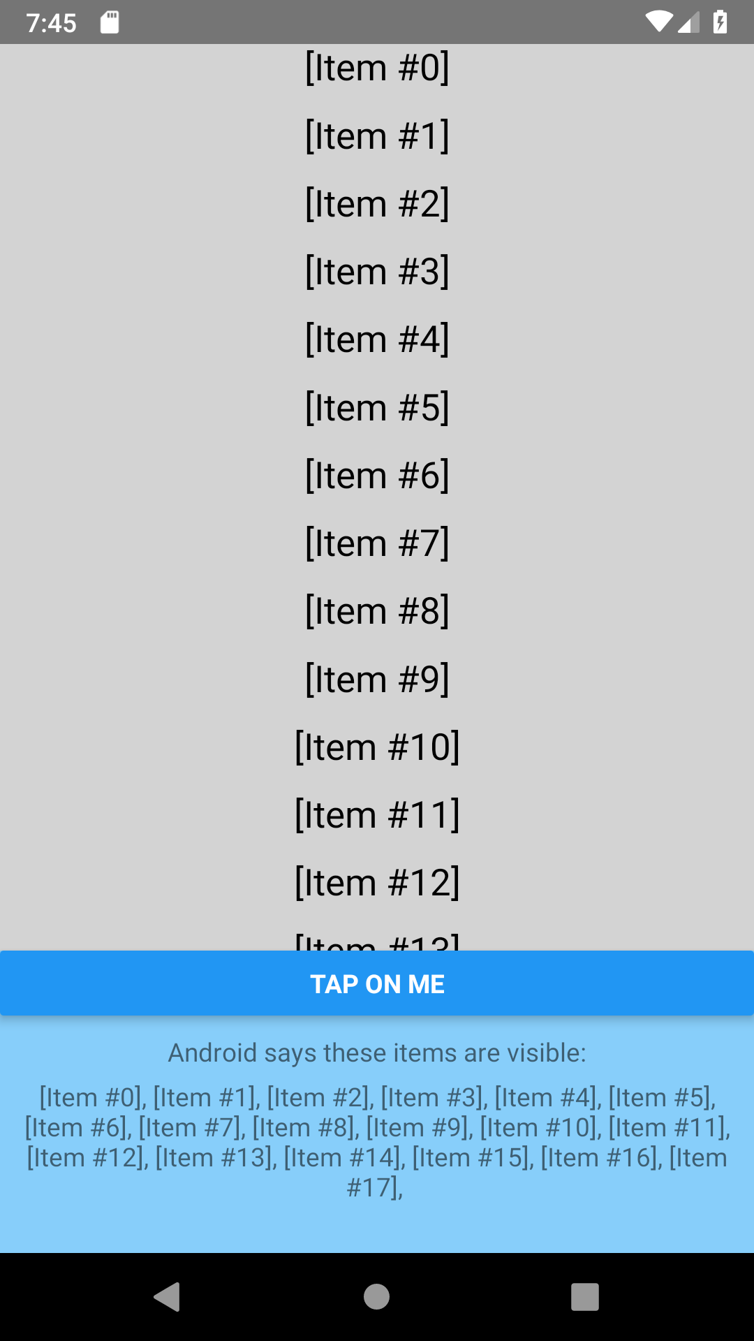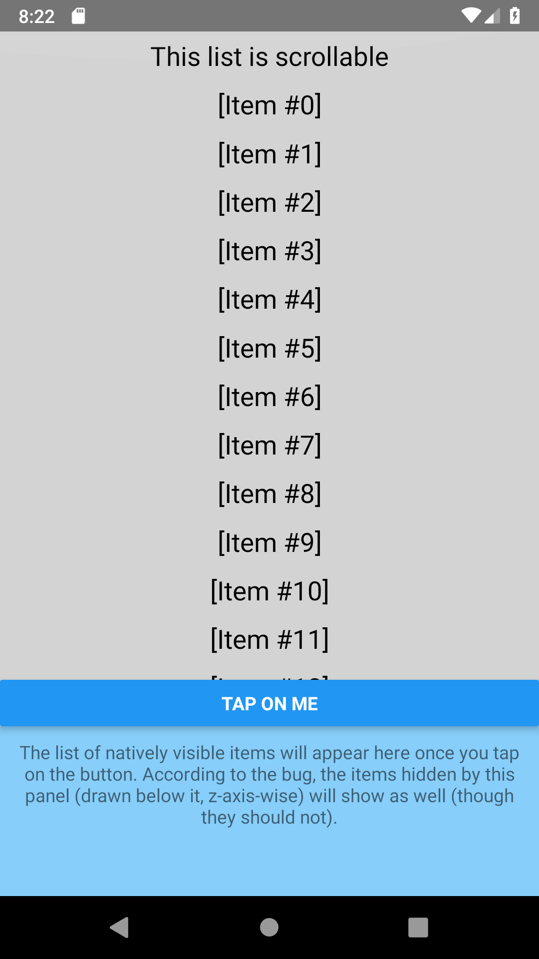 RNClipVisibilityBugDemo A React-Native demo app that demonstrates this RN issue. Screenshots: Initial "introduction" state: Bug in-effect, #1 (list top): Bug in-effect, #2 (list half-way): Single state where bug has no effect (list's end):