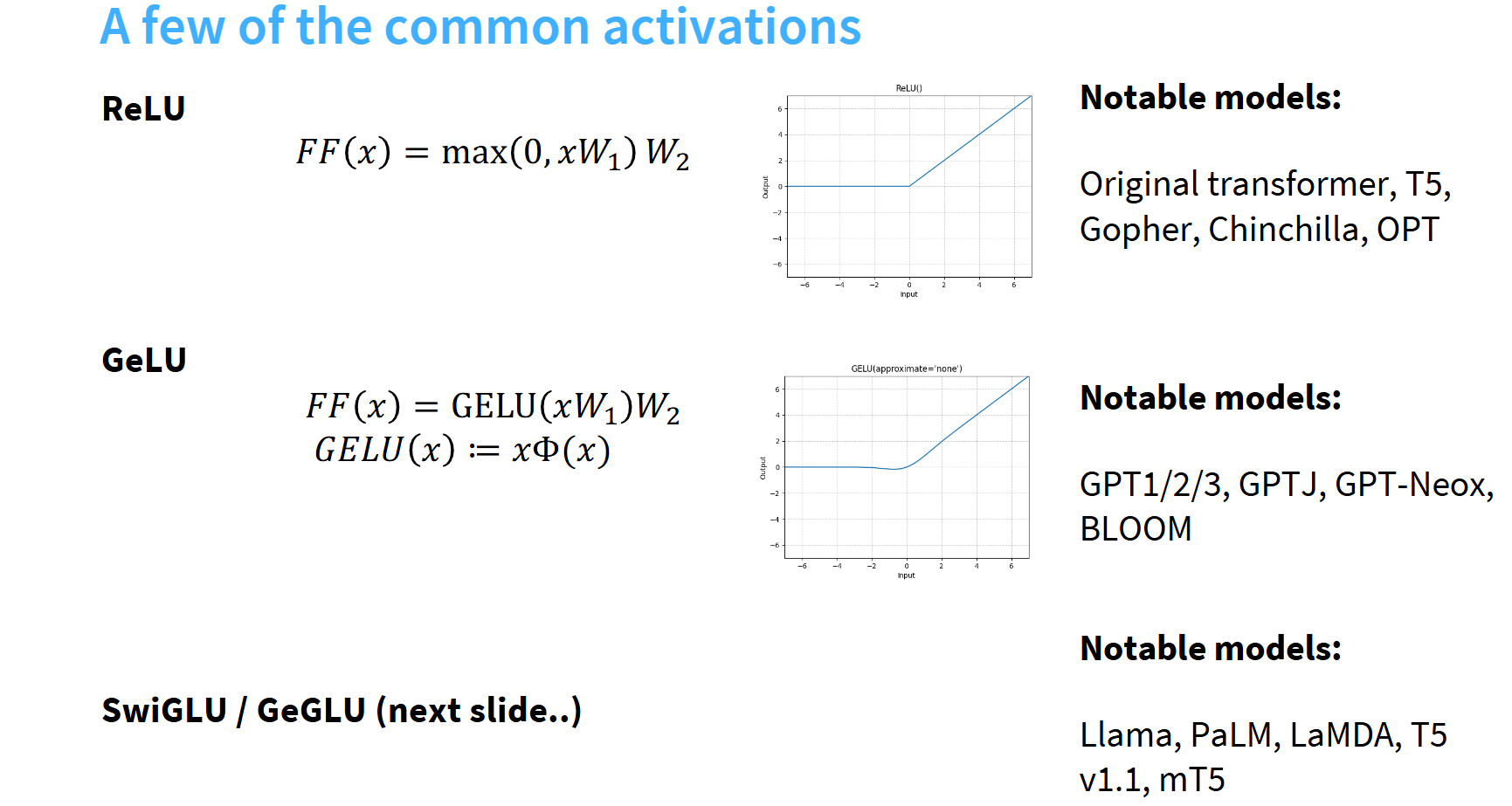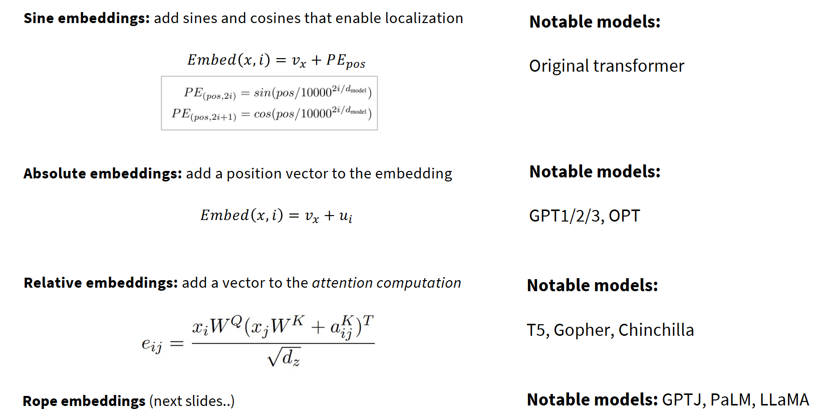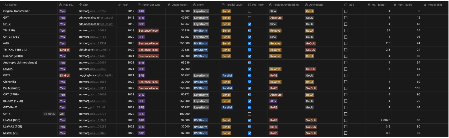 你会发现每个模块都有些创新,比如位置编码这一列,人们曾尝试绝对位置编码、相对位置编码、RoPE,部分模型还经历过ALiBi编码阶段。当然后面会有趋同演化,2023年左右开始,所有人都开始采用RoPE,因为性能更好!Llama-like的架构趋同趋势,Llama作为最受欢迎的开源模型(这个地位正在被qwen系列挑战),改进的架构都具有参考意义。