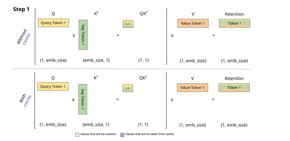我们生成文本时,记住我们生成一个token,然后Transformer读取该token并处理它,接着我们可以得到下一个token的分布,然后我们自回归地一次一个token地执行操作。通过这样做,我们无法并行化生成过程,我们需要为每个新token逐步进行。我们会存储历史计算的K和V的值,这样我们在生成新的token的时候就不用重复计算K和V的值,这称为KV cache。