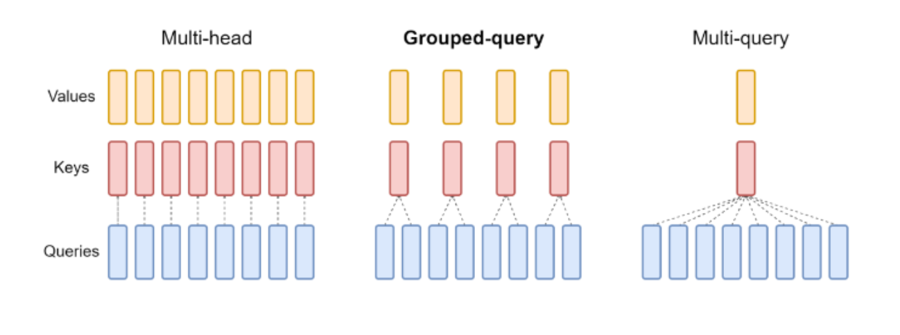 GQA(分组查询注意力)在此基础上稍作调整:不再采用多查询配单键的模式,而是按一定倍数减少键的数量。这样可以在推理时间表现和模型表达能力之间取得平衡。因为从多头注意力直接切换到多查询注意力可能过于激进,