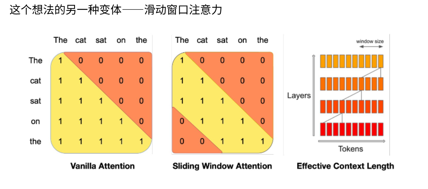 GPT-3最初发布时就采用了这类技巧来实现更大的注意力窗口。滑动窗口注意力是该思想的另一个变体,在每个层级仅关注当前位置的邻近区域。这种方式能有效控制处理长文本所需的总资源量,此时有效感受野等于局部范围乘以层数。虽然这些是较早的思路,但现代实现方式有了新的发展。