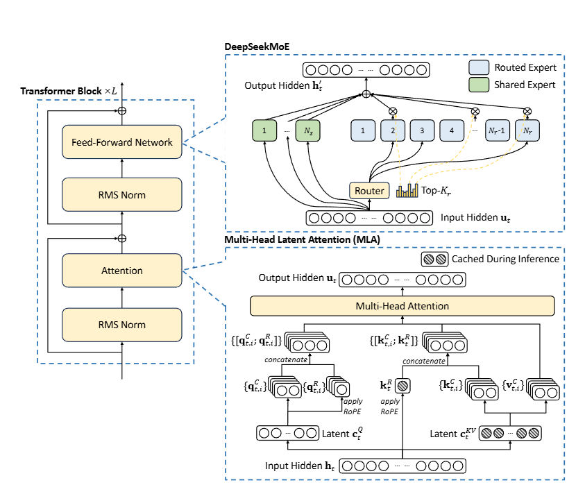 将KV缓存减少93%,DeepSeek-V2 架构示意图如上。MLA通过显著减少生成所需的 KV 缓存,确保高效推理。