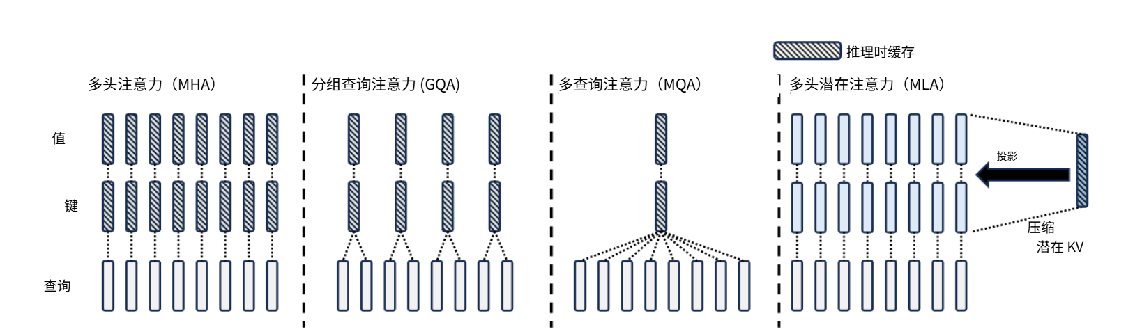 传统Transformer采用多头注意力(MHA),每个注意力头需独立缓存Key和Value向量。对于层数为L、隐藏维度为d、头数为h的模型,KV缓存复杂度为 O(L·h·d),成为长序列推理的主要瓶颈。