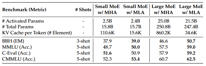 MLA 和 MHA 在困难基准上的比较。DeepSeek-V2(采用MLA)的性能优于 MHA,但所需的 KV 缓存量显著更小。MLA虽然未被广泛使用,仅仅在deepseek系列中使用,但是deepseek出色的模型性能已经向我们证明了这项技术的能力。