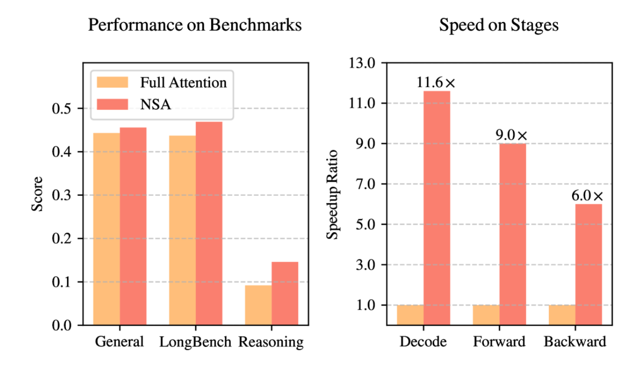 由deepseek发布的论文(获得ACL 2025最佳论文)来看,NSA与全注意力相比,得分略胜,在速度上则是完胜。对于 64k 长度序列的处理,NSA 在全注意力机制的所有阶段(解码、前向传播和后向传播)中均实现了显著的计算加速