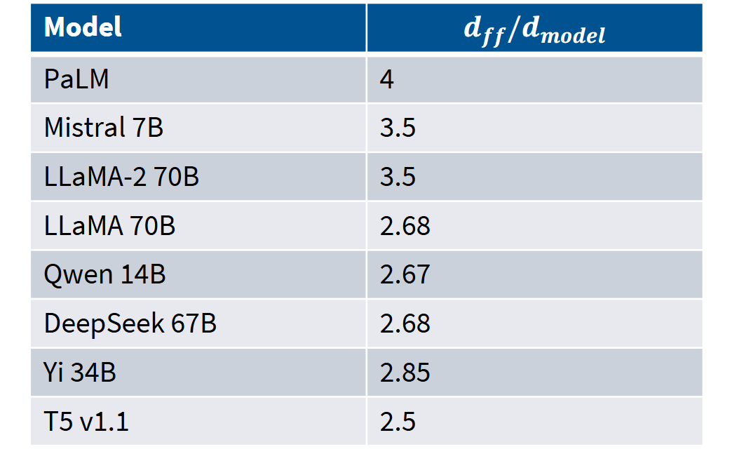 以PaLM为例,Mistral和LLaMA的设定稍大些。虽然它们都是GLU模型,但并未遵循2.6倍规则。而LLaMA-1、Qwen、DeepSeek、Yi和T5等模型都大致遵循2.6倍左右的设定