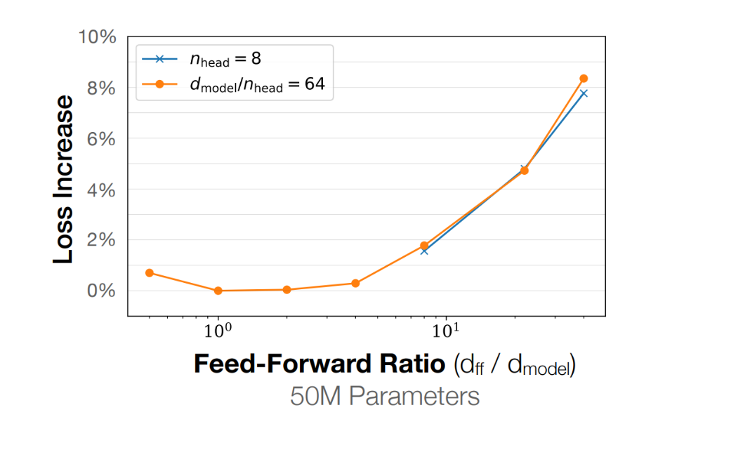 我们应该有个思考:是否有人通过更量化的实验证明这是合理的,在JaredKaplan的缩放定律论文中,虽然大多数人关注的是缩放定律部分,但实际上论文还包含非常有用的超参数研究。你会发现他们正好研究了我提到的$d_{ff}$与$d_{model}$比例,并绘制了随该比例变化时损失值的增长曲线。图中显示存在一个最佳区间,比例从1到10左右都有较宽的选择范围,你可以任意选择前馈网络比例而结果都接近最优。