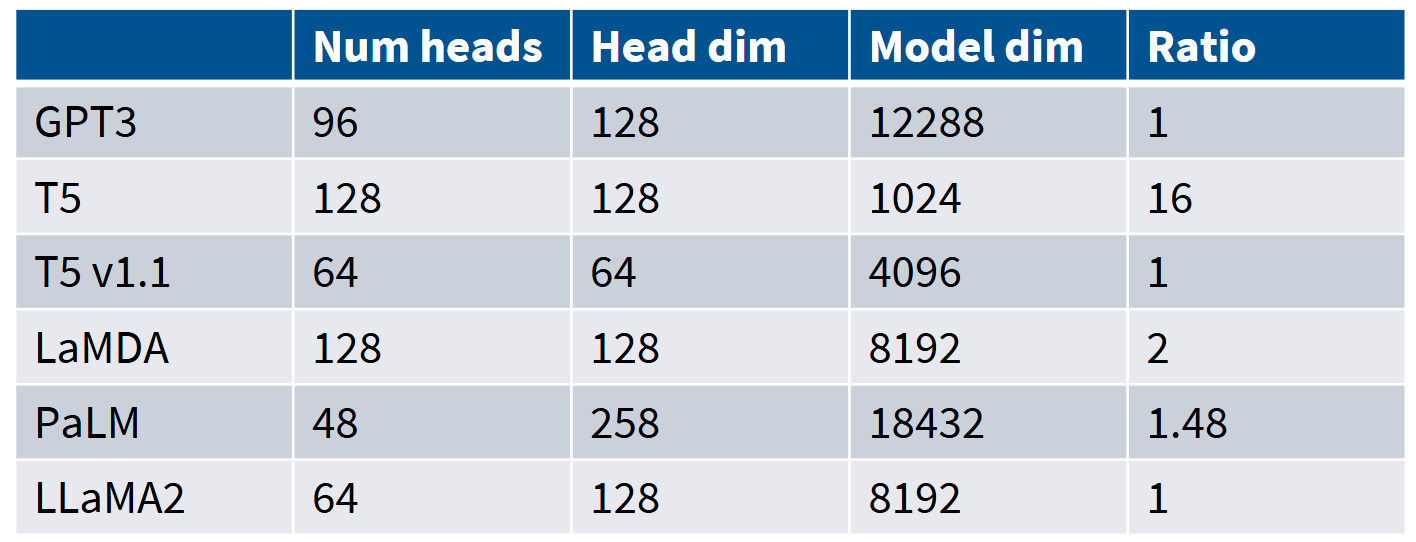 另一个超参数共识是模型维度与头维度乘以头数量的比例。标准做法是保持每个头的维度固定而增加头数量,当然也可以选择保持单头维度不变来增加注意力部分的参数量——但大多数模型都遵循前一种方案。我们看到GPT-3、T5、LaMDA、PaLM和LLaMA2这些模型,它们的比例都是1或几乎精确等于1,