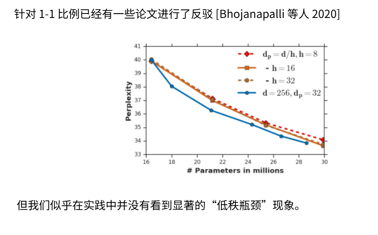 Bhojanapalli等人2020年的研究,他们提出如果注意力头数量不断增加,其秩会越来越低。如果每个头的维度非常少,就会开始影响注意力操作的表达能力。但在实践中,我们似乎并没有遇到太多显著的低秩瓶颈问题。大多数采用1:1比例的模型都表现得很好。