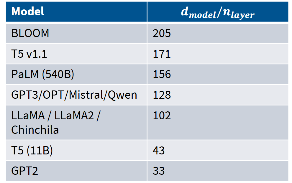 普遍存在的一个最佳准则是:每层需要约128个隐藏维度。这个标准被很多GPT-3和LLaMA变体模型所遵循。