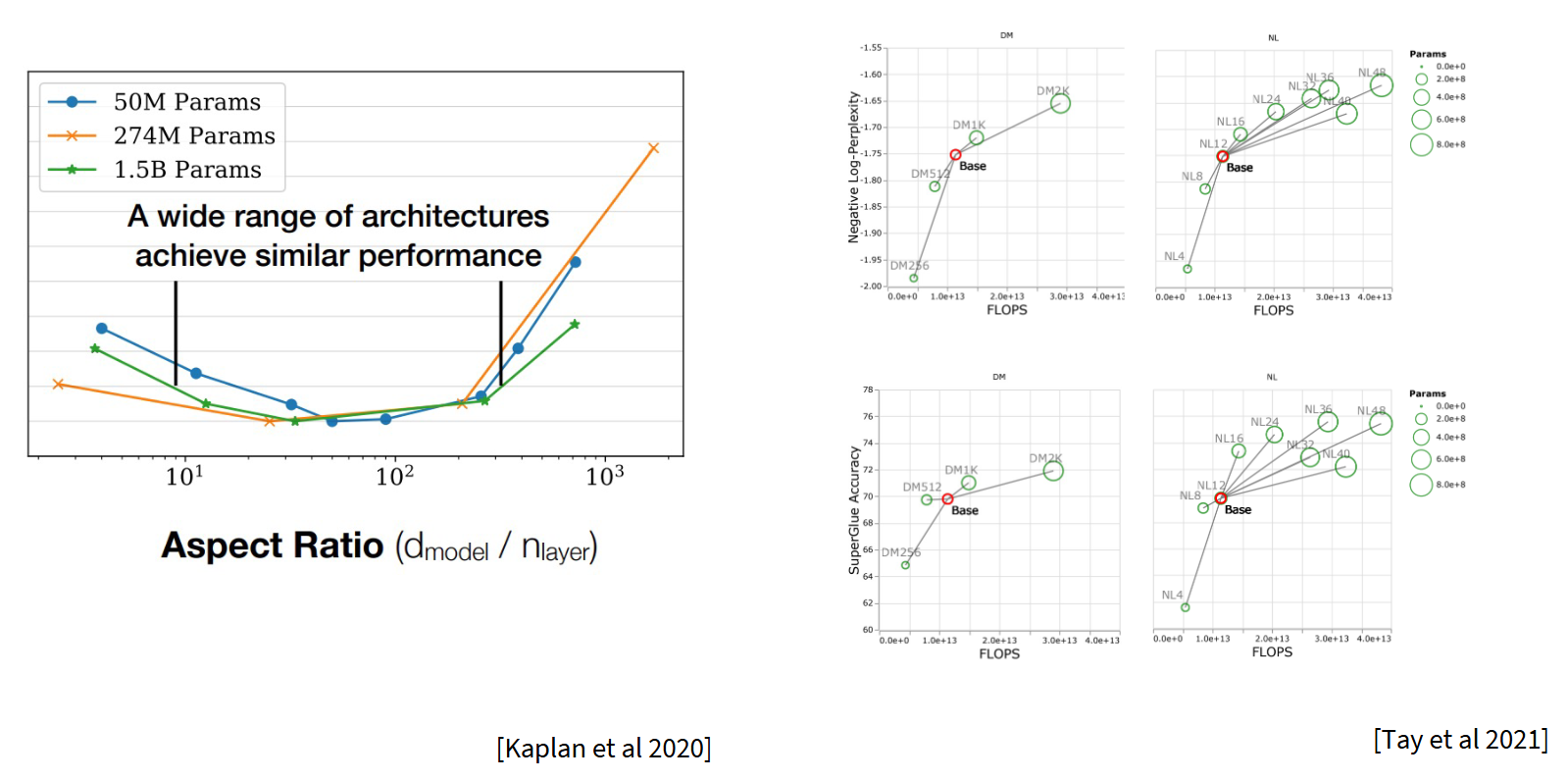 Google的ETay等人有一项非常有趣的研究,探讨了深度与宽度在上游和下游任务中的影响。他们发现:如果仅关注损失值,那么深度并不重要,参数数量才是唯一关键因素。但当下游准确率作为评估指标时,情况就不那么明确了。当时,他们正在研究微调后的SuperGLUE准确率。他们认为在相同计算量(FLOPs)下,更深的模型可能表现更好。这项工作的后续研究并不太多。但从长宽比的角度来看,下游任务的实际表现可能会略有不同。