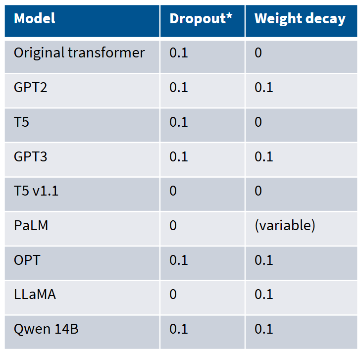 许多旧模型在预训练期间使用了dropout,较新的模型(除 Qwen 外)仅依赖权重衰减。
