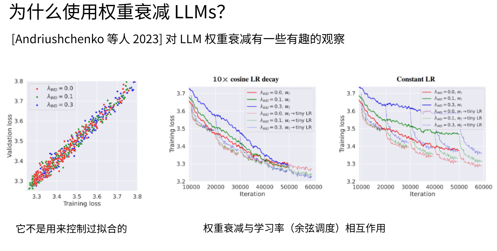 实施权重衰减并非为了正则化模型(虽然这原本是设计初衷),而是为了获得更低的训练损失。之所以能达到这个效果,是因为在训练末期随着学习率趋近于零时,各种学习动态产生了特殊作用。这是个非常有趣且复杂,甚至在某种程度上令人困扰的语言模型特性。但现在你们应该明白,为什么很多技术报告都会注明“我们使用了权重衰减”。