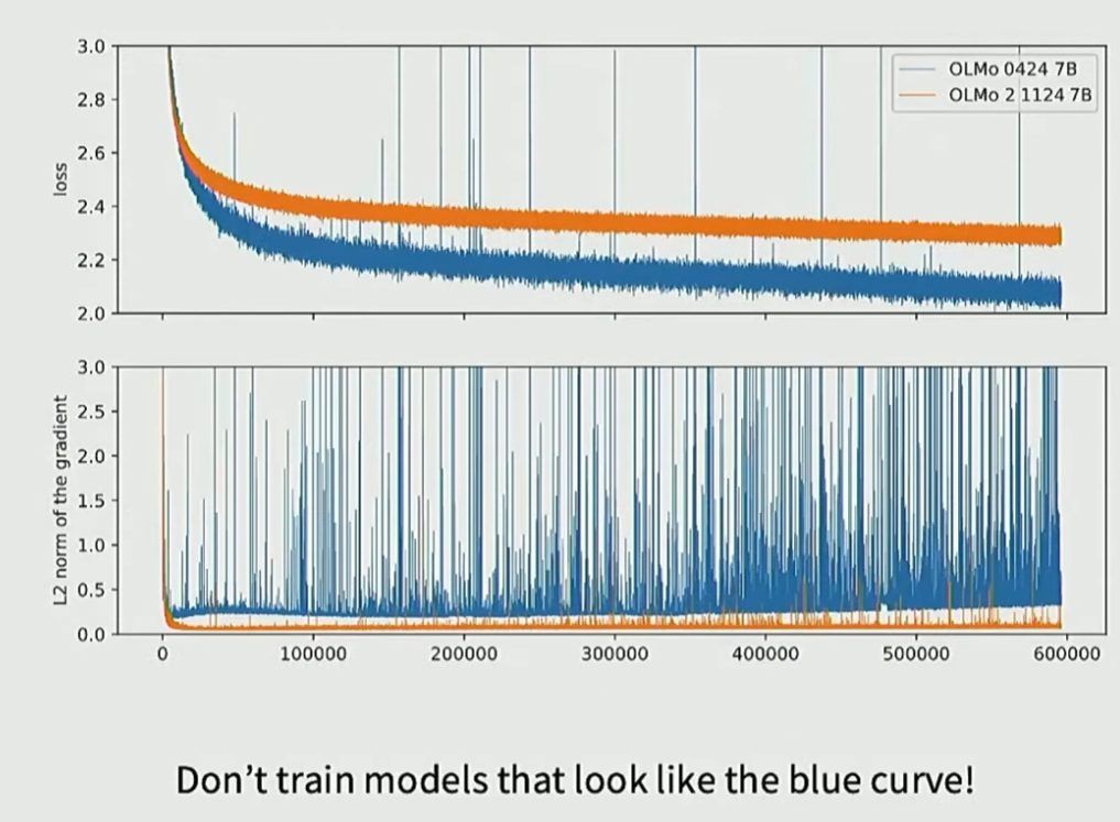 我们从OLMo2论文中可以看到这个案例,该论文在LLM训练稳定性方面提供了出色的学术成果。他们首先展示了这张图表:观察这里的蓝色曲线,这个梯度图的L2范数令人触目惊心。虽然损失曲线看似正常,但会不时出现异常尖峰。打开梯度范数图,会发现布满尖峰的恐怖图像,范数值完全失控。