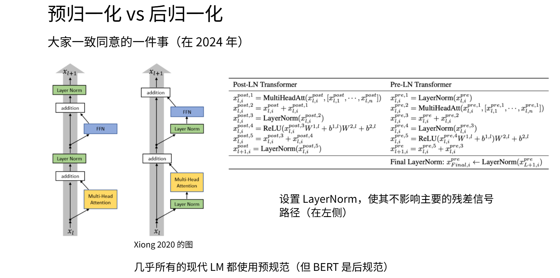 这是 Transformer 原始论文的设计,即后归一化方案(左侧图):灰色残差连接流在通过子层后,再与输入相加,最后执行 LayerNorm。但很快人们发现,将 LayerNorm 移至残差连接之前(即预归一化)能在多方面获得更好效果(右侧图,Pre-LN)。