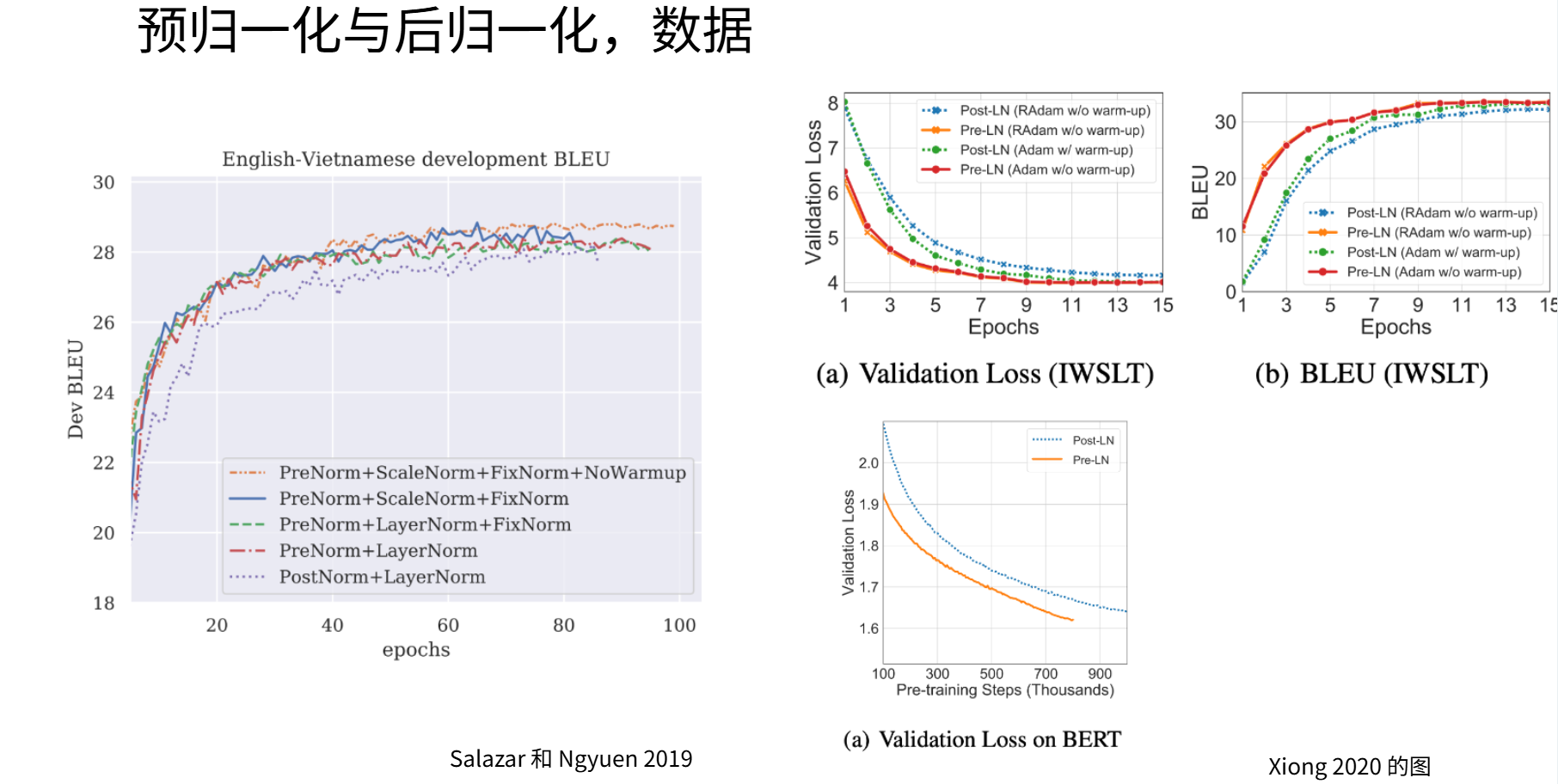 采用预归一化配合其他稳定化技巧后,即使不使用预热机制,系统表现也能媲美甚至优于需要精细预热方案的后归一化LayerNorm。左图展示了机器翻译场景下的对比结果,右图则显示在各类任务(特别是使用后归一化训练的BERT)上的趋势。