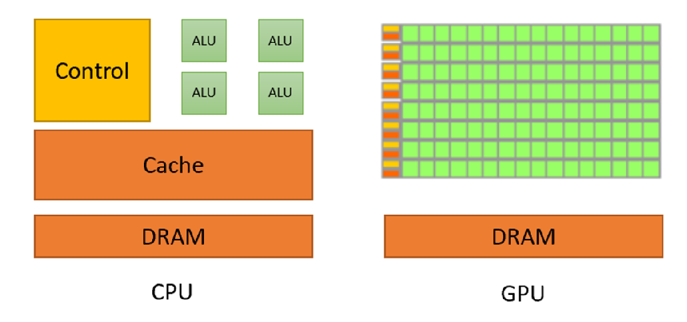 上面这幅图可以看到:CPU的计算单元(绿色部分)少,大部分用来控制(Control)和缓存(Cache)这决定了它可以进行复杂的逻辑运算,GPU则不同,他的控制单元少(黄色部分),大部分都是绿色的计算单元,这决定了它可以进行大量并行计算简单的乘法和加法运算,复杂的逻辑和复杂的计算就不行了。GPU主要就是优化吞吐量,追求所有任务整体最快完成。控制逻辑仅占芯片面积的极小部分,计算单元(ALU)占绝大多数。所以我们在使用GPU时还要CPU的调度,一个好的GPU要配上好的CPU才能发挥作用。