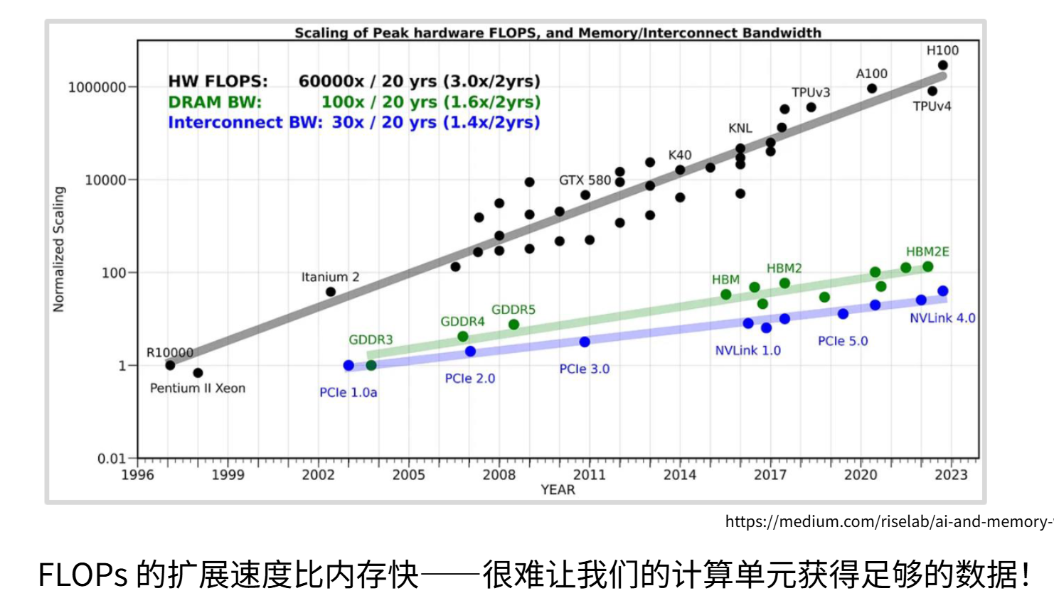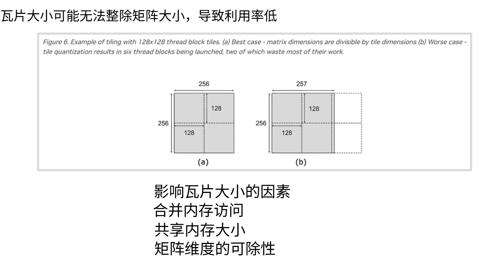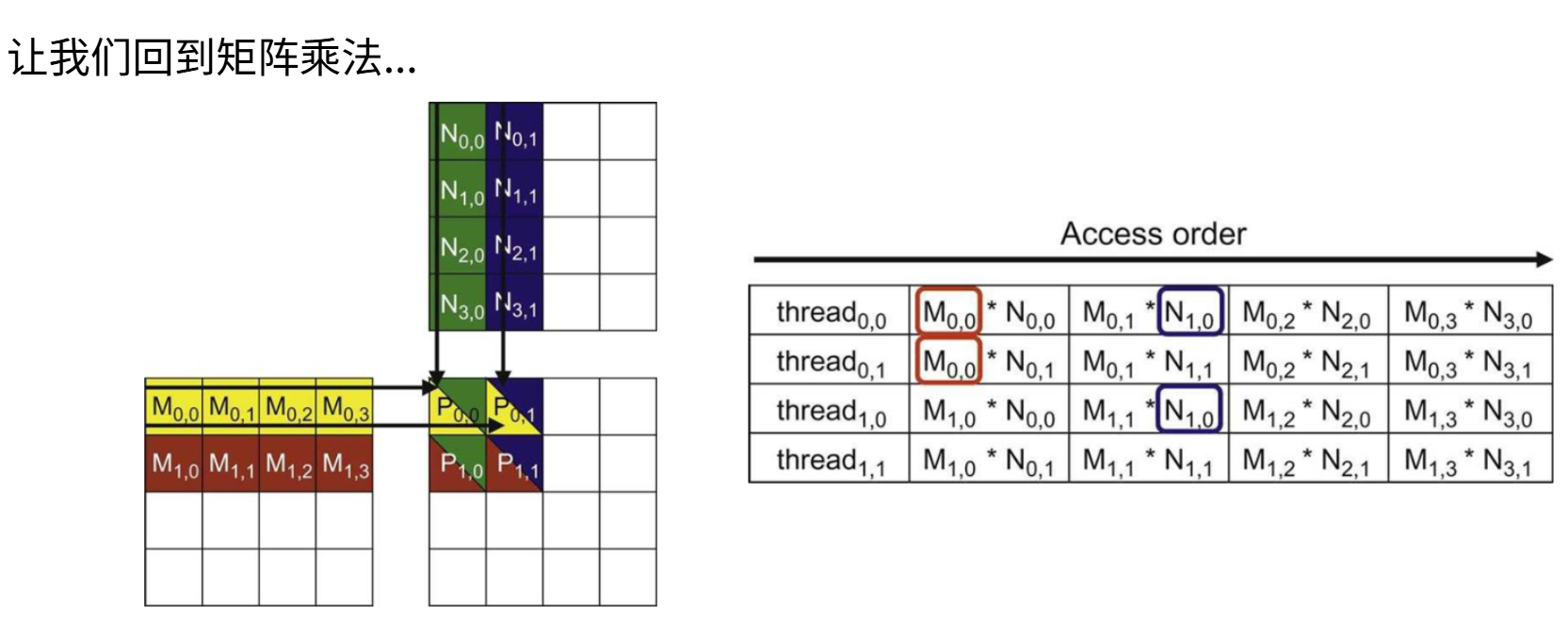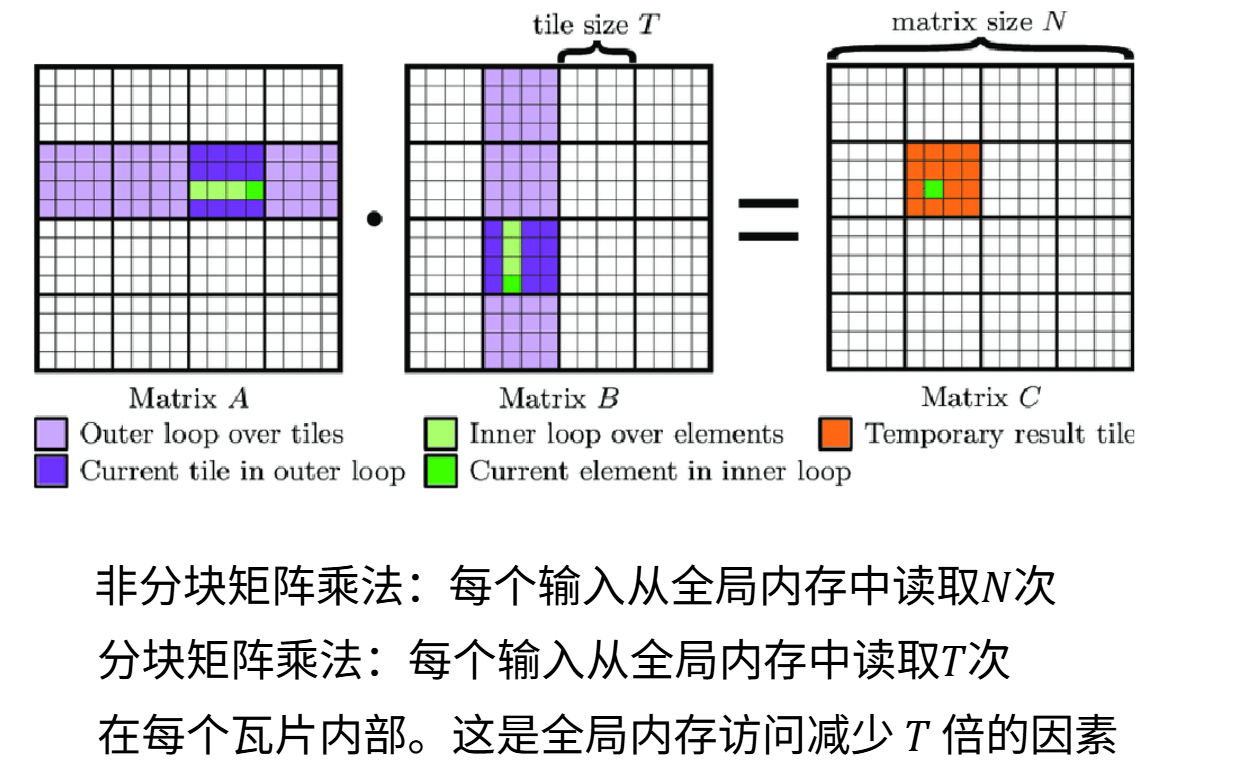 你可以从上图左侧看到访问这些存储所需的速度,SM内部存储器的访问速度要快很多,大约只需20个时钟周期就能从中获取数据,而访问L2缓存或全局内存则需要200到300个时钟周期。这个10倍的差距会对性能造成严重影响。如果某段计算需要访问全局内存,可能意味着你的SM会无工作可做,矩阵乘法全都完成了,任务耗尽,只能空转。这样利用率就不会高。这在某种程度上将成为思考内存架构的核心主题,也是理解GPU工作原理的关键。