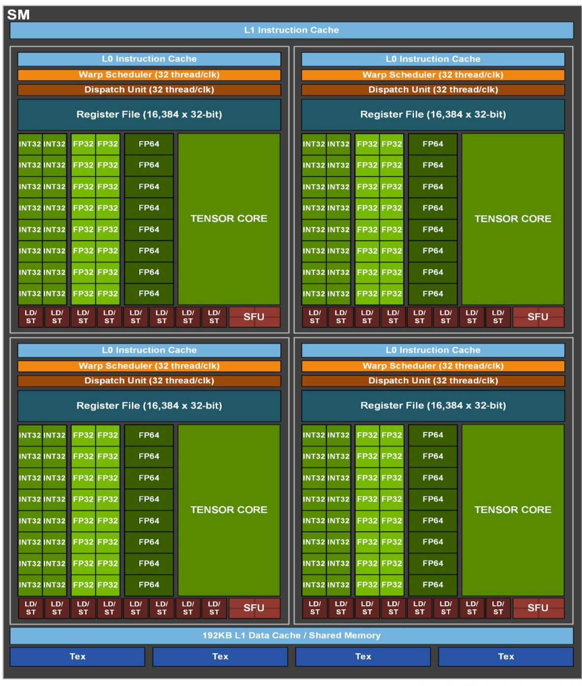 SM的独特之处是在于CUDA核心,64个/组,共4组 = 256个CUDA核心/SM(实际配置为64个FP32 + 64个INT32),同时还有第三代Tensor Core,支持结构化稀疏(性能翻倍),并和支持双精度FP64(消费级GPU没有)