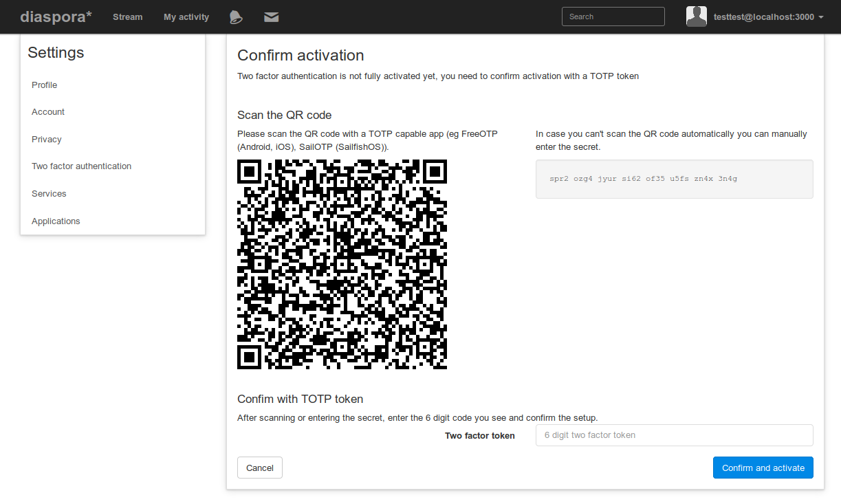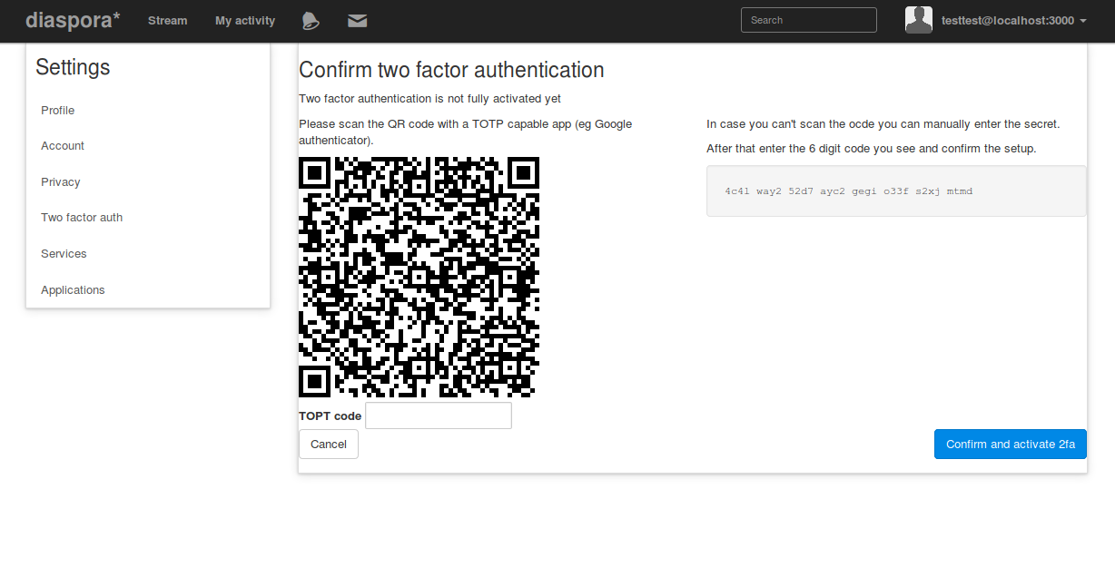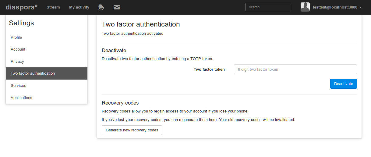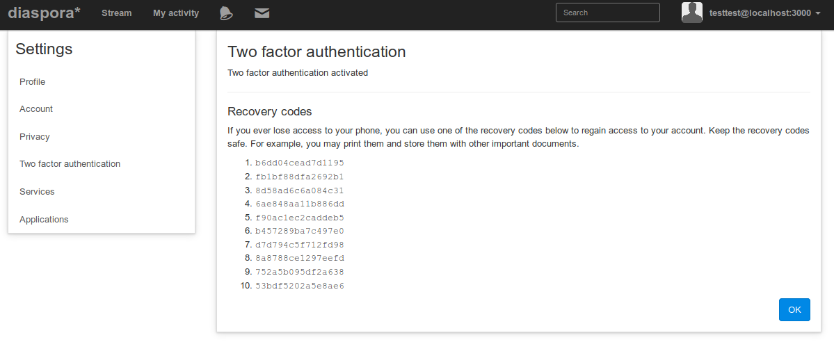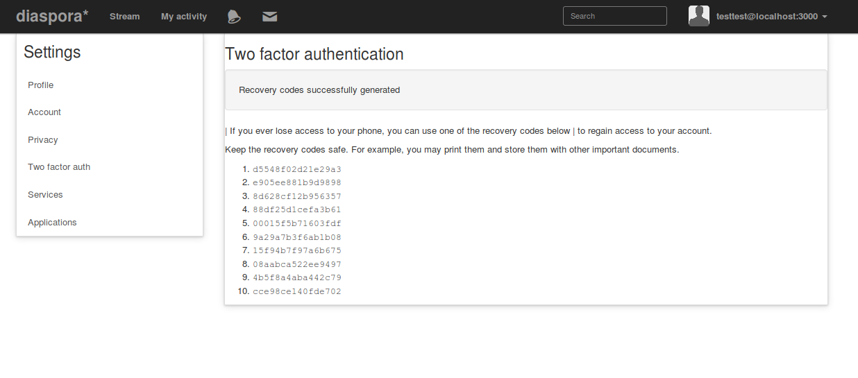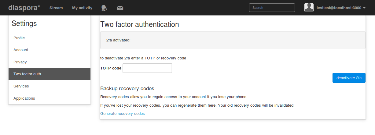 - I'm a bit afraid of the support load this new feature can bring. Framasphere moderators are already spending a lot of time with users who lost access to their account (that's why we have feature requests like #7442). The question is, is 2FA added to protect users from a stolen password (if so, then when resetting the password by e-mail, the 2FA code should not be asked) or is it also aimed to protect them if their email gets compromised, like you did here. (In that case, you're in trouble anyway but eh, that's in part why 2FA has been built), At least the podmin should be able to access recovery code easily I guess, as we will probably be asked them a lot...