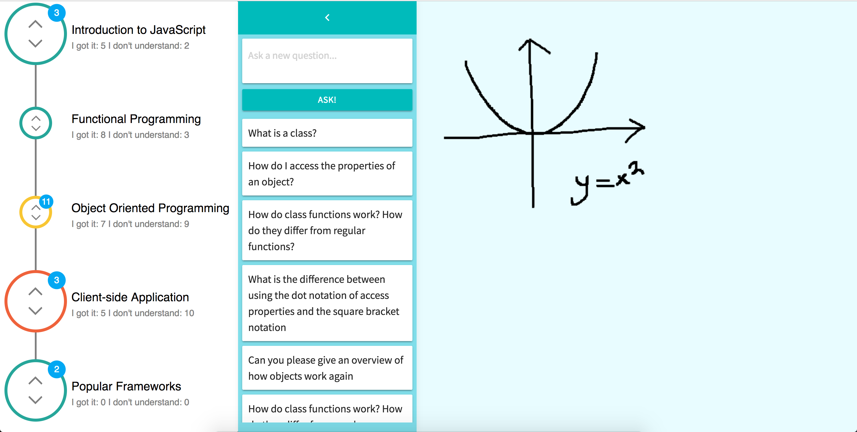 Content in virtual whiteboard is streamed real time to students. Students can upvote/downvote a specific topic to indicate their understanding: